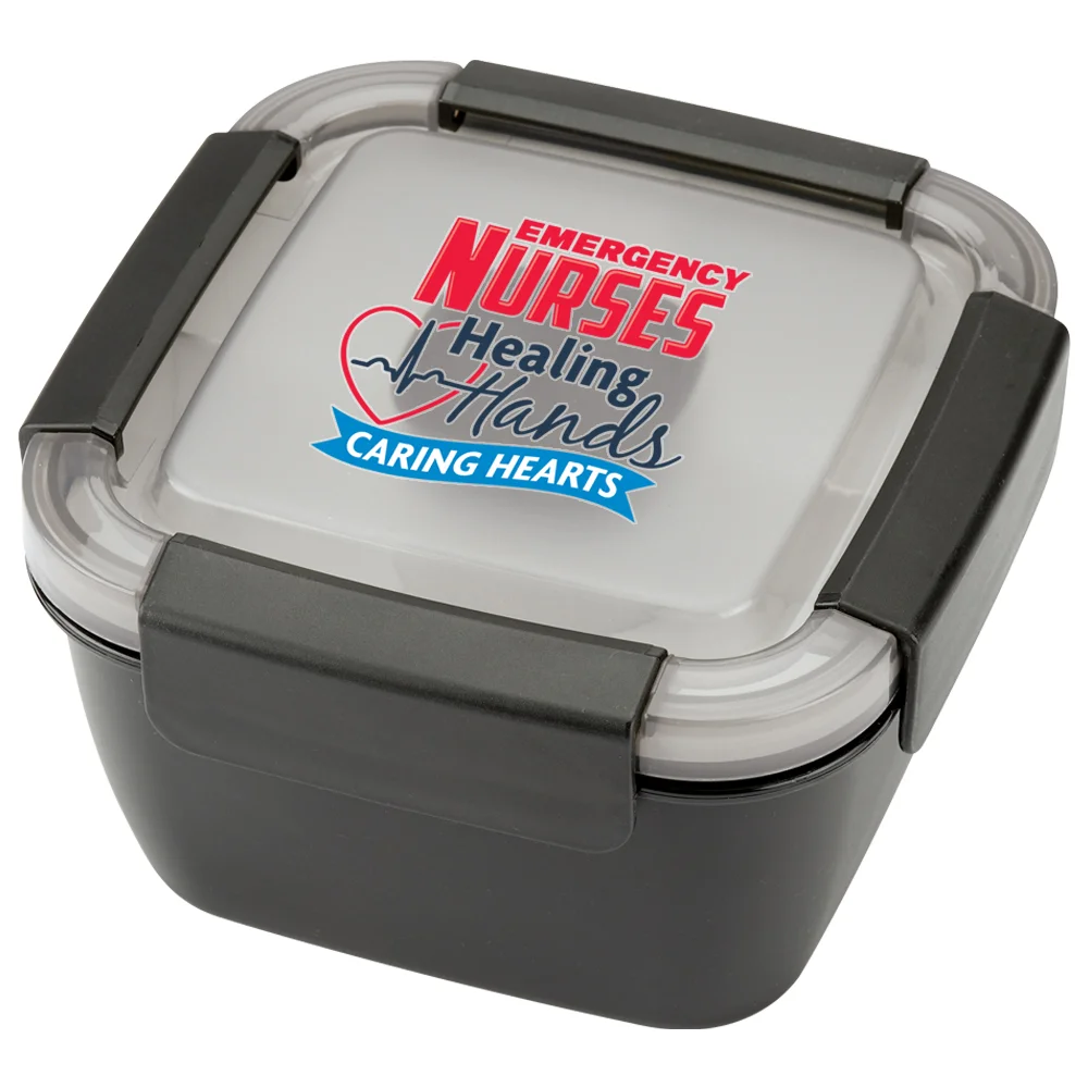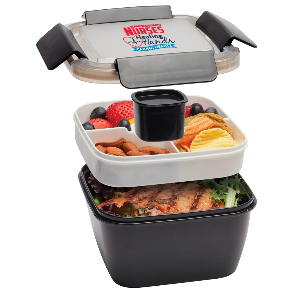 Locking Food Container With Compartments 54 oz.: Plastic and silicone; Hinged locking tabs; Airtight, spill resistant; Bottom compartment holds 54 oz. (6.75 cups); Multi-compartment tray sits on top; Removable, lidded container in center holds 3 oz.; Includes reusable fork; Eco friendly; BPA free; Note: Freezer, microwave, and dishwasher safe