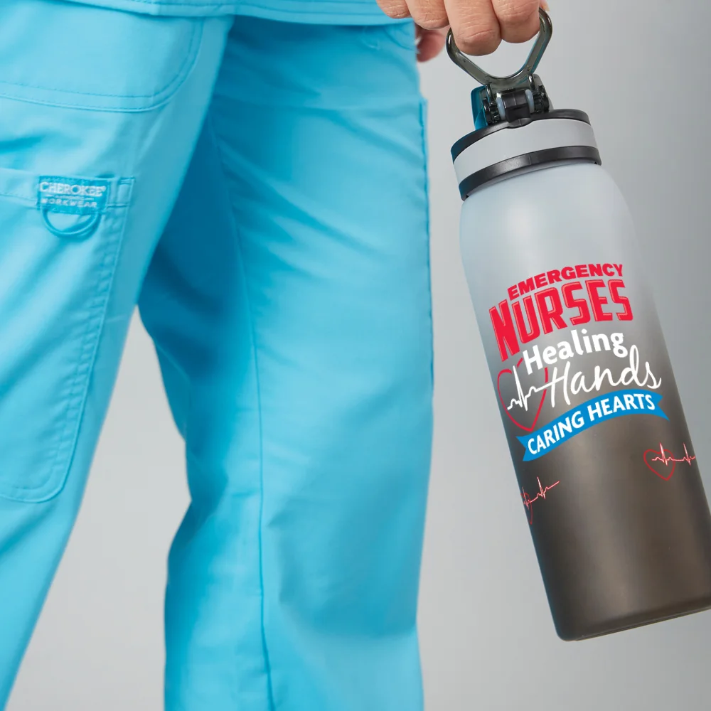 Jasper Ombre Tritan™ Water Bottle 32 oz.: Lightweight, durable Tritan™ will not absorb or retain odors; Pop-up, leak-proof, locking lid with silicone band; Flips up to access sipper spout; Removable strainer beneath lid; Finger loop; Eco friendly; Reusable; BPA free; Note: Hand wash recommended