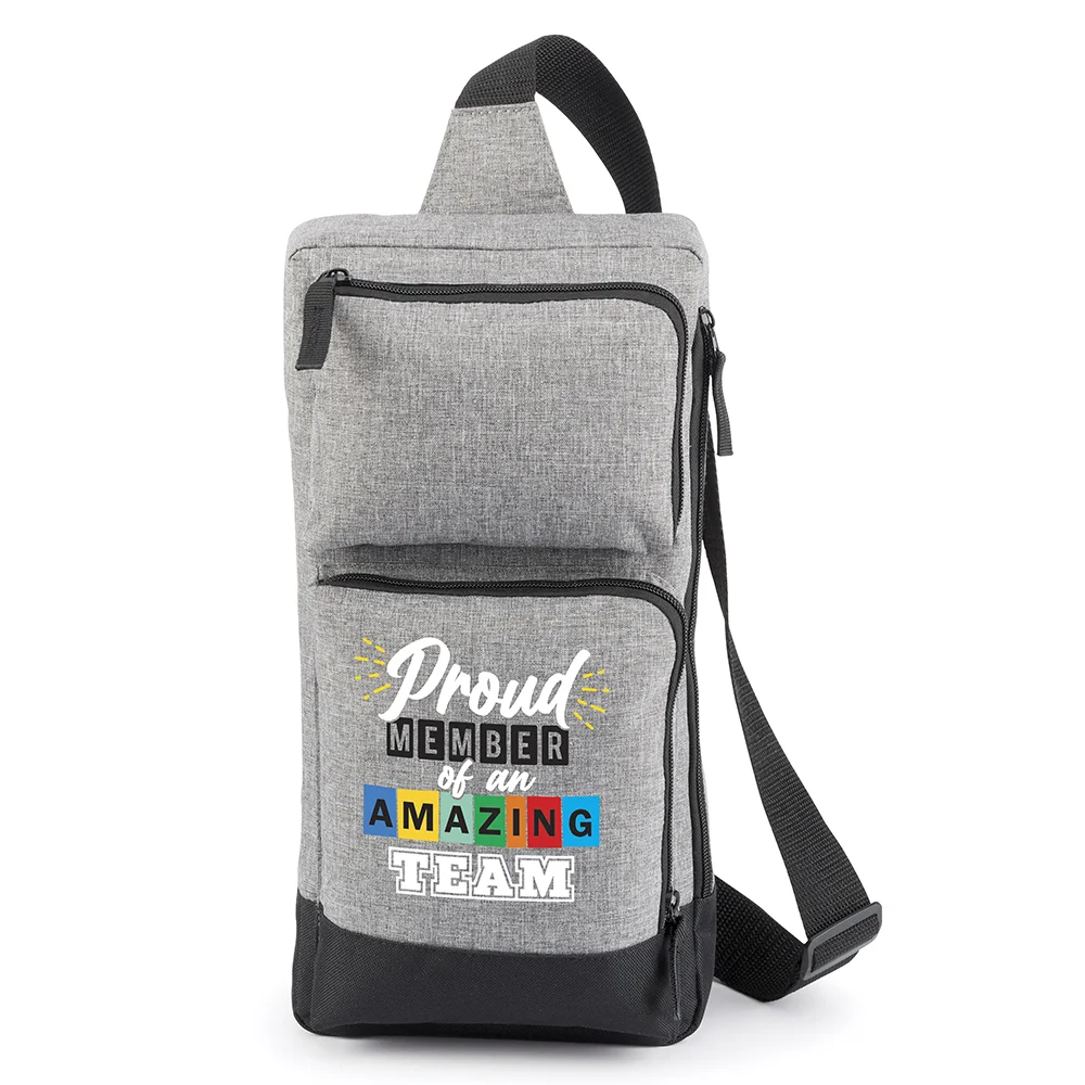 Modesto Multi-Pocket Sling Bag: Wide, adjustable strap can be worn across front or back of body or slung over shoulder; Ergonomic, single-strap design; Roomy interior compartment with vertical side zip opening; Two exterior zip pockets; Heathered 600-denier polyester