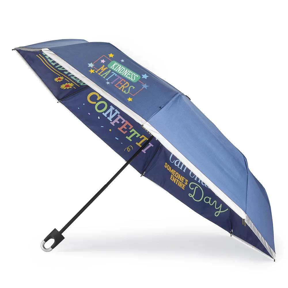 38" Motivational Clip Umbrella With Safety Reflective Trim: Magnetic-closure carabiner on rubberized handle; Silver trim around canopy reflects lights; Manual open/close; Telescopic metal shaft; Folds down to 11"; Storage sleeve included; Full-color design with 8 repeating positive messages inside the canopy