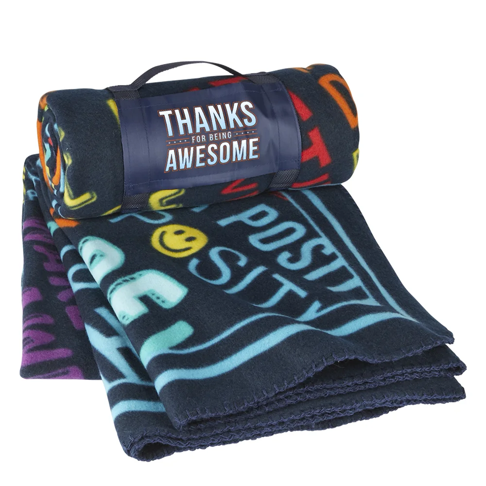 Motivational Word Cloud Roll-Up Eco Blanket: 340-g., 190-gsm., 100% recycled polyester microfleece; Soft, durable, machine washable; Rolls up and secures with removable straps; Eco friendly; 60" x 48" unfolded; Blanket features a Motivational Word Cloud pattern