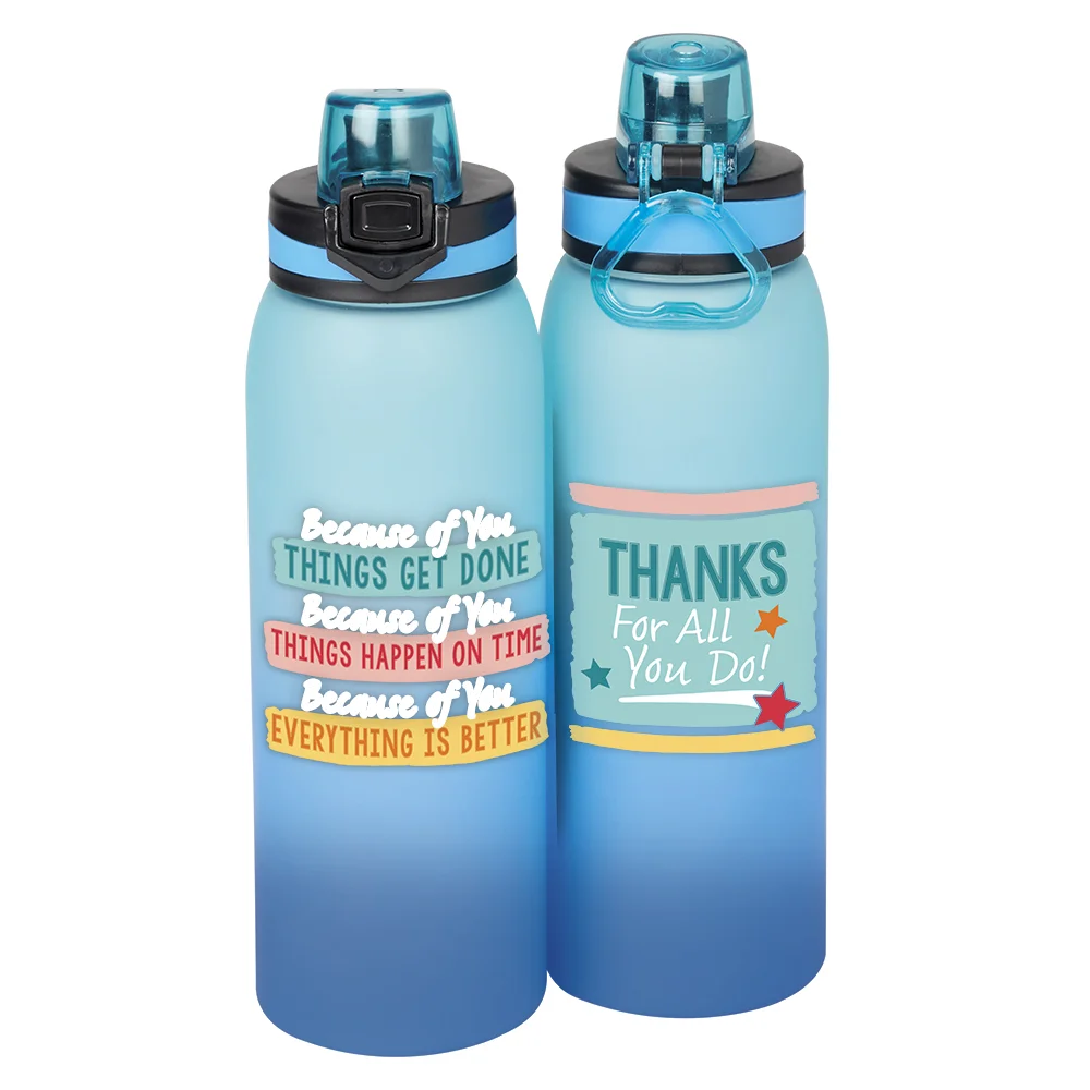 Jasper Ombre Tritan™ Water Bottle 32 oz.: Lightweight, durable Tritan™ will not absorb or retain odors; Pop-up, leak-proof, locking lid with silicone band; Flips up to access sipper spout; Removable strainer beneath lid; Finger loop; Eco friendly; Reusable; BPA free; Note: Hand wash recommended