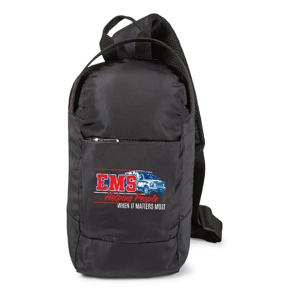 Ventura Crossbody Sling Bag: Zip-shut main compartment & front pocket; Interior tablet pocket; Padded, adjustable sling strap carries across chest or back; Dual D-rings for left or right carry; Oversized carry handle; Top grab handle; Soft memory fabric returns to original shape
