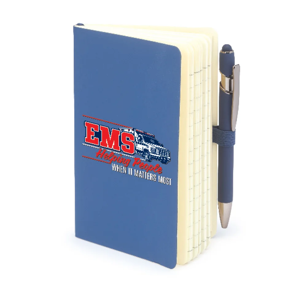 Mini Pocket Journal With Mini Metal Stylus Pen: Soft-touch cover; 80 lined FSC®-certified pages; Space to record entry date; Ribbon page marker; Pocket in back cover; Elastic strap and pen loop; Mini stylus pen with smooth metal barrel, titanium accents; Black ink