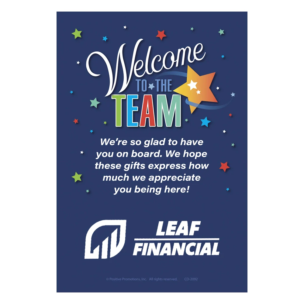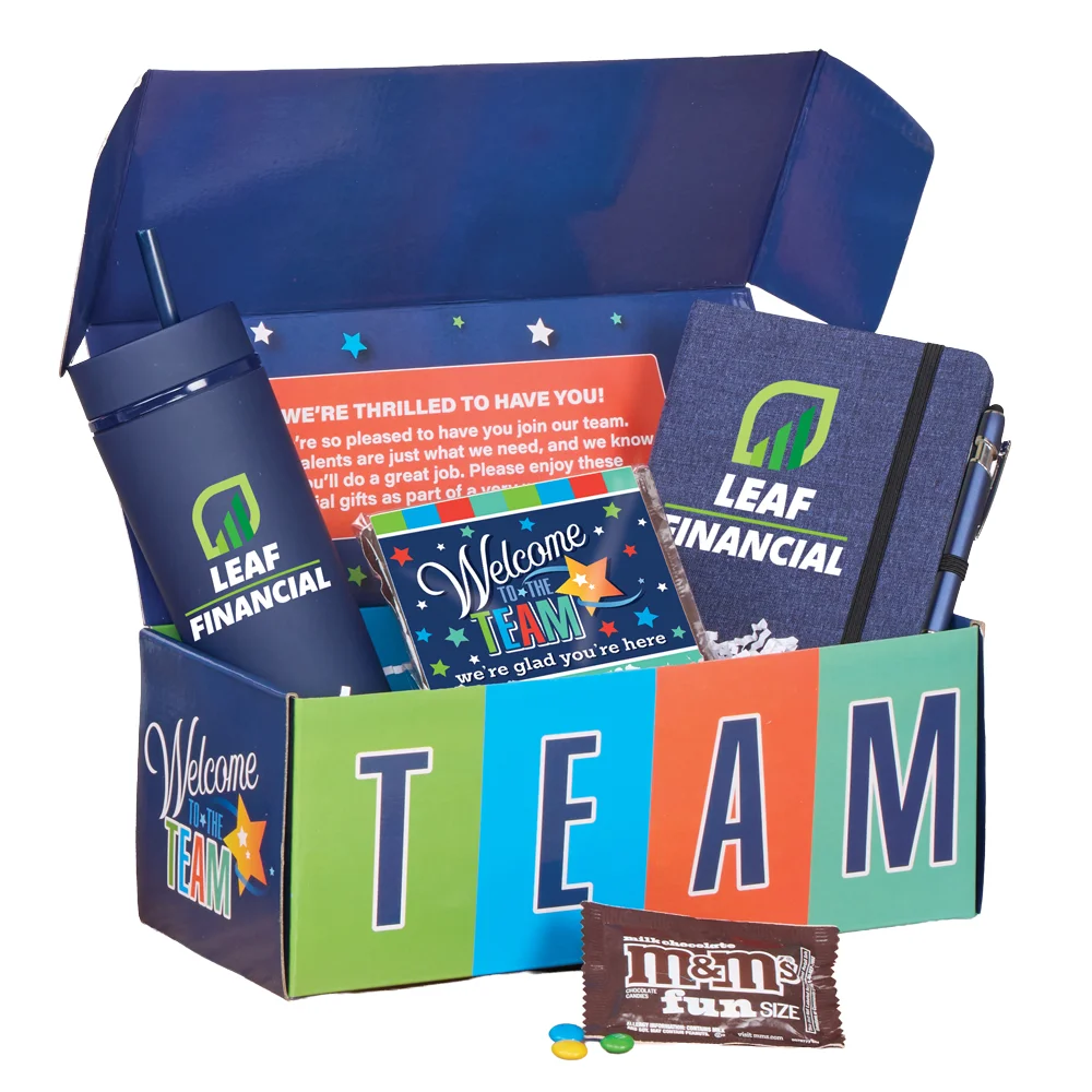 Gift box included; Message inside lid: We're thrilled to have you! We're so pleased to have you join our team. Your talents are just what we need, and we know you'll do a great job. Please enjoy these special gifts as part of a very warm welcome!