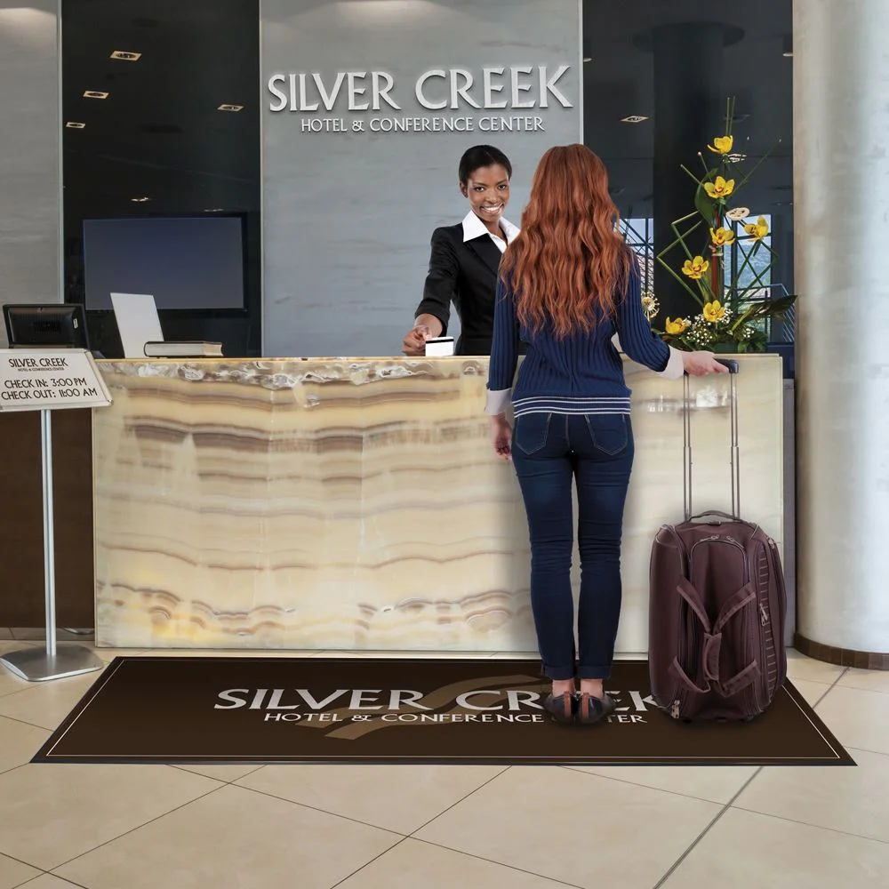 * Put quality designs right at your feet Floor Hugger mats feature a nylon yarn surface with black rubber borders and backing Treated with Stainstopper and static dissipative Will not crack or curl Mat sizes are not exact; allow 3-5% size variance Not eligible for Rush Service