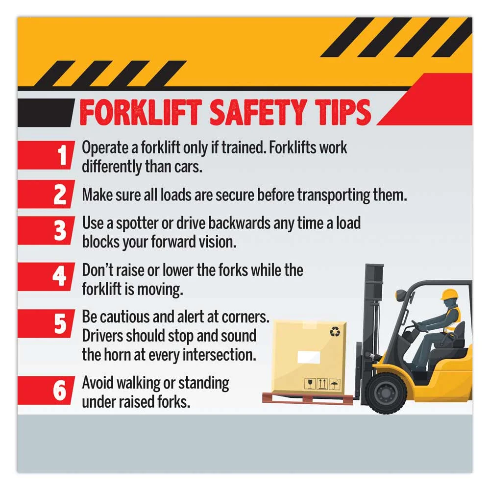 • Back lists 6 tips, including Don't raise or lower the forks while the forklift is moving and 5 more