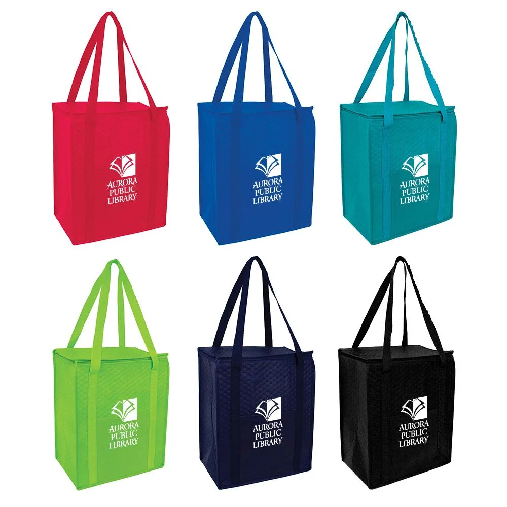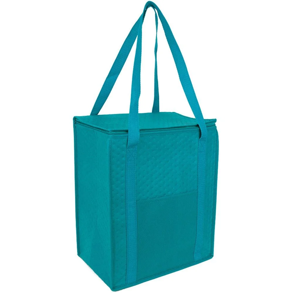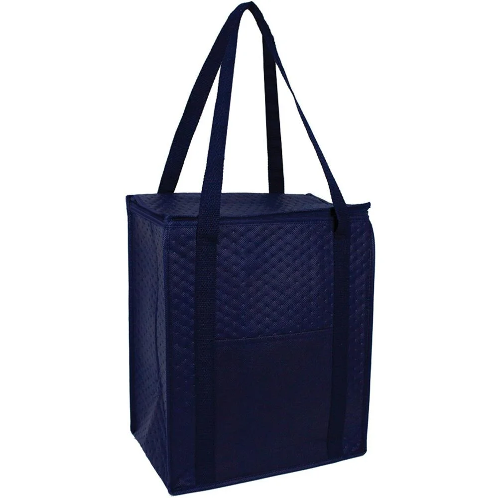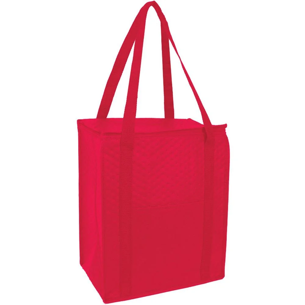 * Jumbo size hot/cold cooler tote with foil lining to keep food insulated & front open pocket. Includes drop-in board for support. Comes in 6 fabric colors with matching color handles. Imprint on front pocket only.
