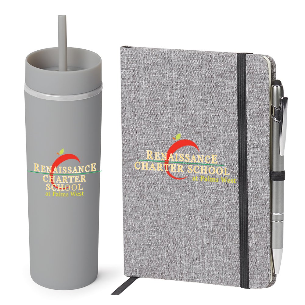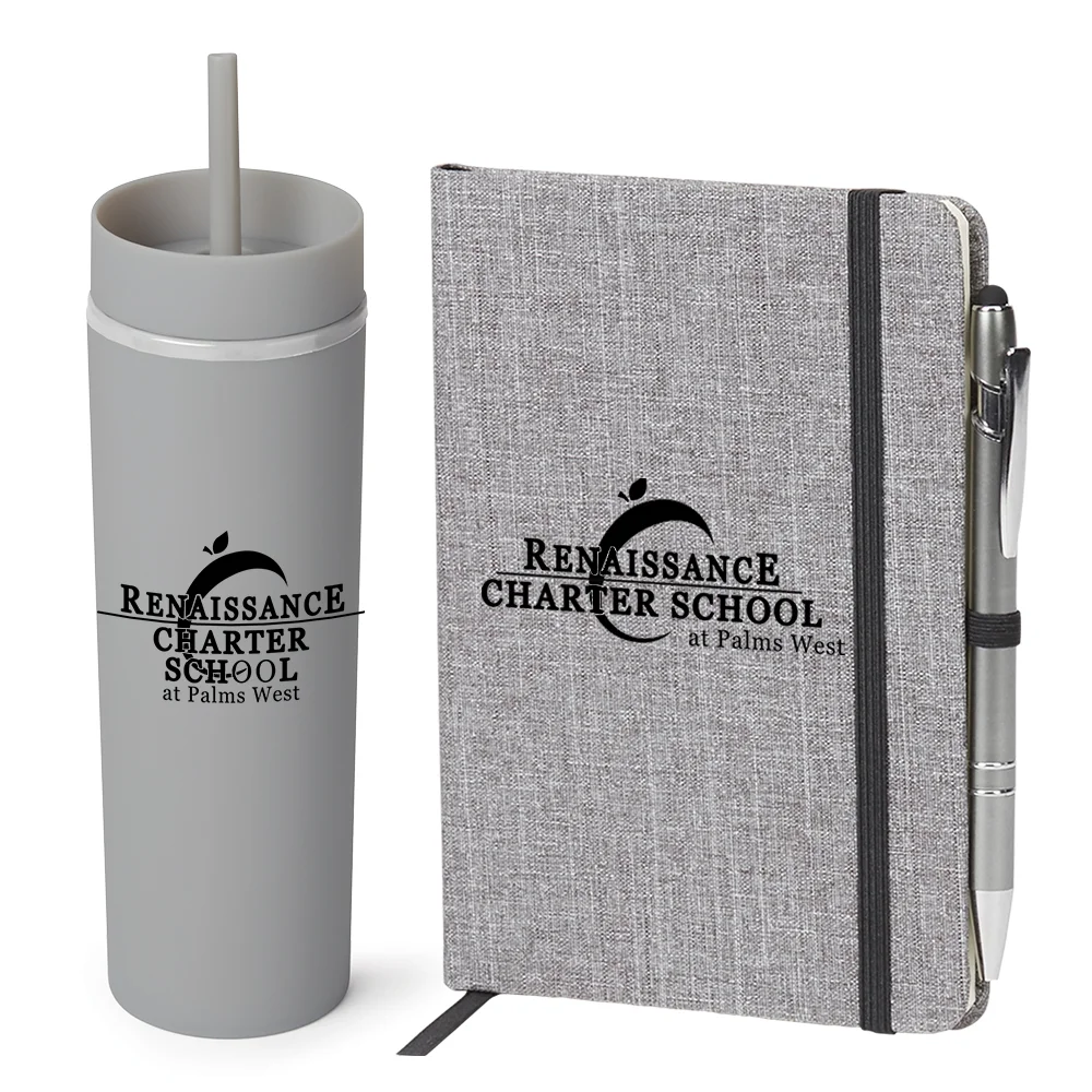 2-piece gift set includes: Heathered Journal With Quotes & Stylus Pen & Canyon 2-in-1 Tumbler & Sipper 16 oz.
