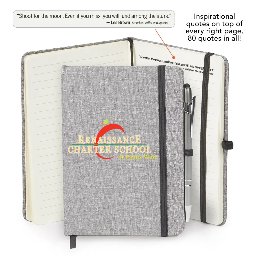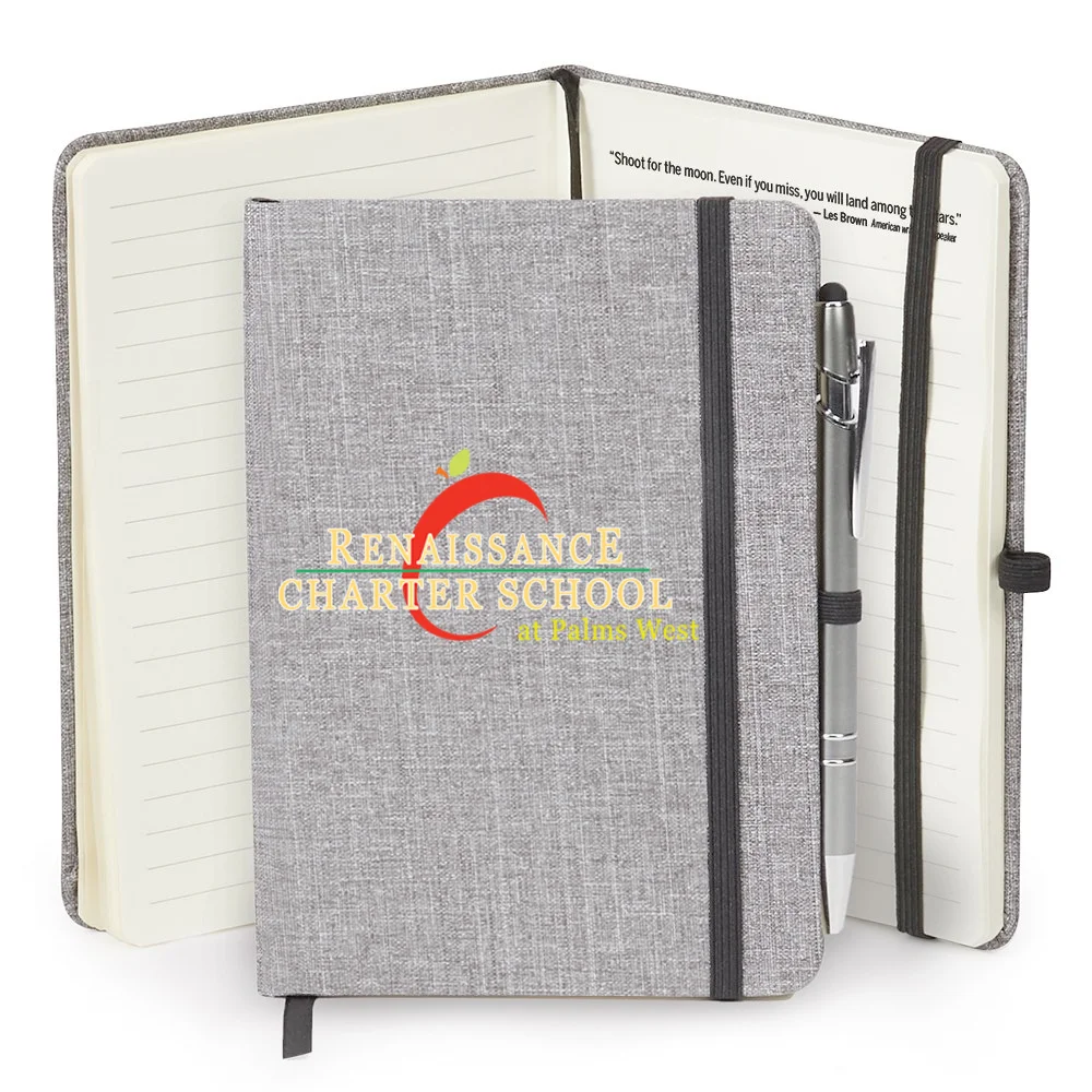 Personalized Journal & Blank Stylus: Heathered, linen-like hard cover; 80 lined pages; Ribbon bookmark, elastic closure, and elastic pen loop; Stylus Pen included for note-taking and touchscreen navigation; Black ink; Note: Pen remains blank
