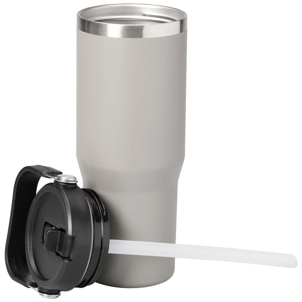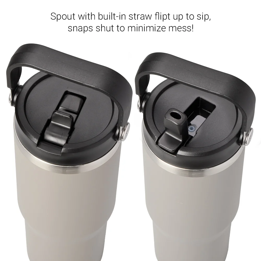 Spout with built-in straw flips up to sip, snaps shut to minimize mess