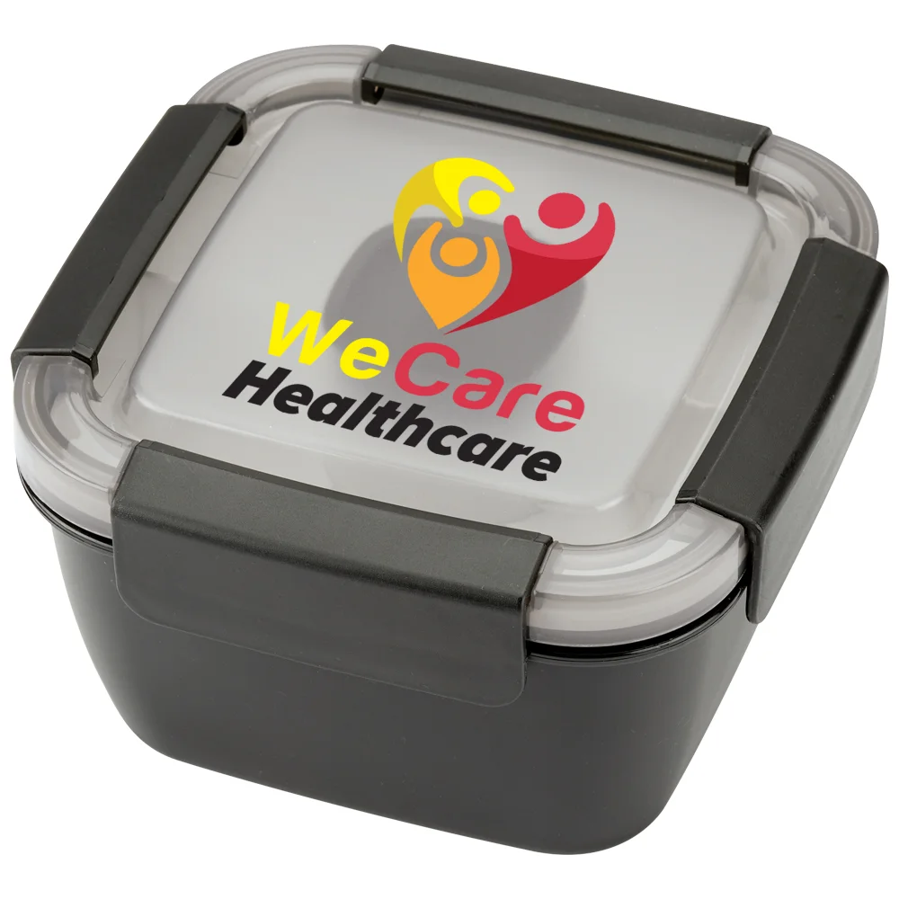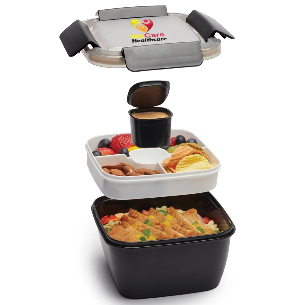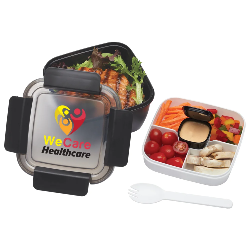 Personalized Food Container: Travel-friendly food container keeps entire meal fresh and organized; Plastic and silicone construction with hinged locking tabs creates an airtight, spill-resistant lid; Entree-sized bottom compartment holds 54 oz. (6.75 cups); Multi-compartment tray separates fruits, veggies, and sides; Sits on top of large compartment; Removable, lidded container in center holds 3 oz. of toppings, dips, or dressing; Included reusable fork tucks neatly inside; Eco friendly; BPA free; Note: Freezer, microwave, and dishwasher safe