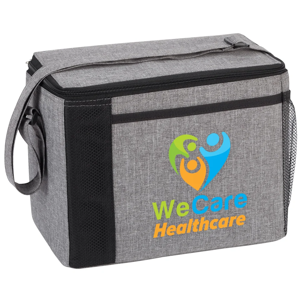 Personalized Lunch/Cooler Bag: Reusable bag that keeps contents fresh on the go; Flip-top lid with zip-around closure; Two zipper pulls for full access to large compartment; Front slip pocket for utensils or small essentials; Side mesh pocket stores even more; Insulated lining is easy to wipe clean; Strap adjusts for hand or shoulder carry; ID window on back; Holds up to 8 cans; Heathered 300-denier polyester with contrast trim
