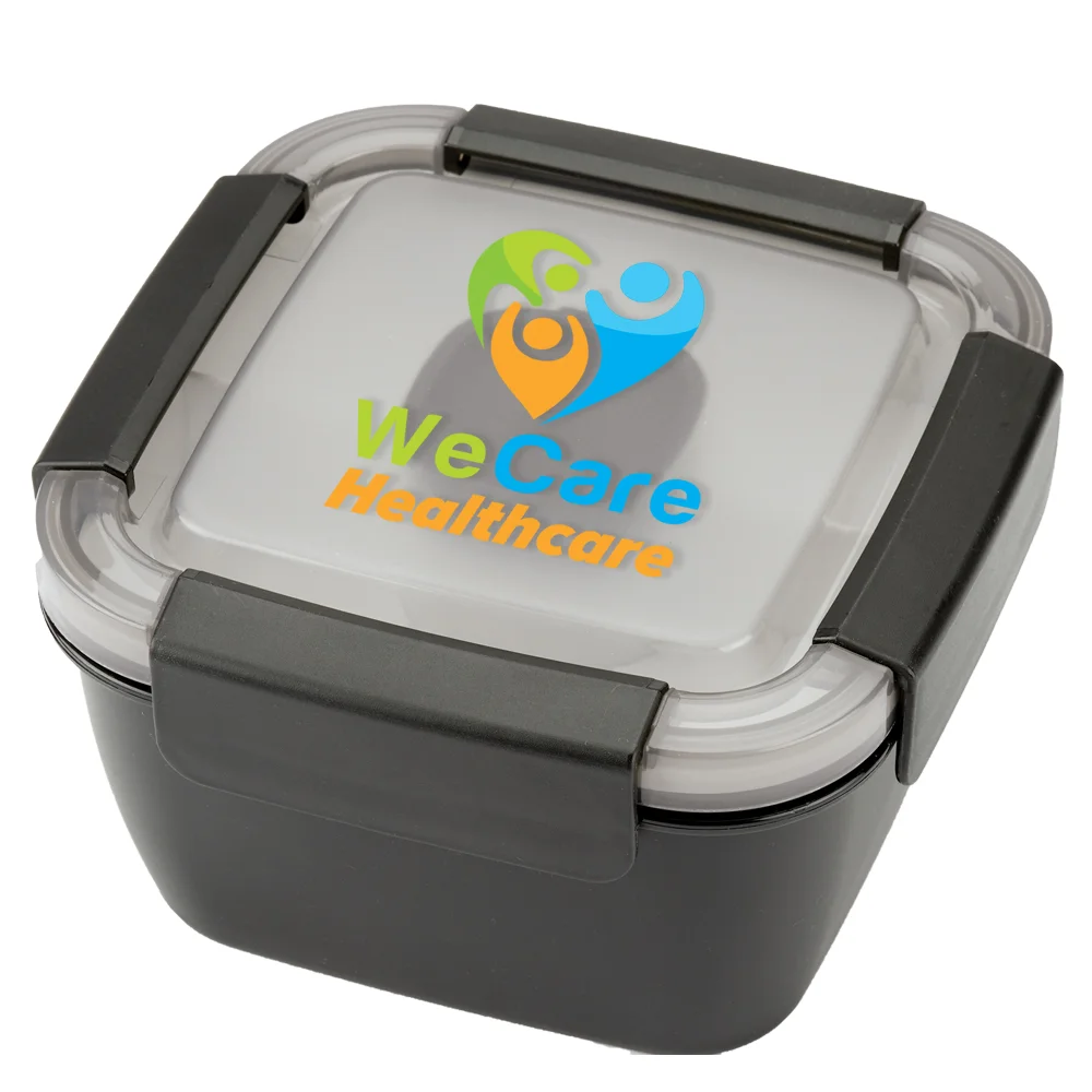 Personalized Food Container: Travel-friendly food container keeps entire meal fresh and organized; Plastic and silicone construction with hinged locking tabs creates an airtight, spill-resistant lid; Entree-sized bottom compartment holds 54 oz. (6.75 cups); Multi-compartment tray separates fruits, veggies, and sides; Sits on top of large compartment; Removable, lidded container in center holds 3 oz. of toppings, dips, or dressing; Included reusable fork tucks neatly inside; Eco friendly; BPA free; Note: Freezer, microwave, and dishwasher safe