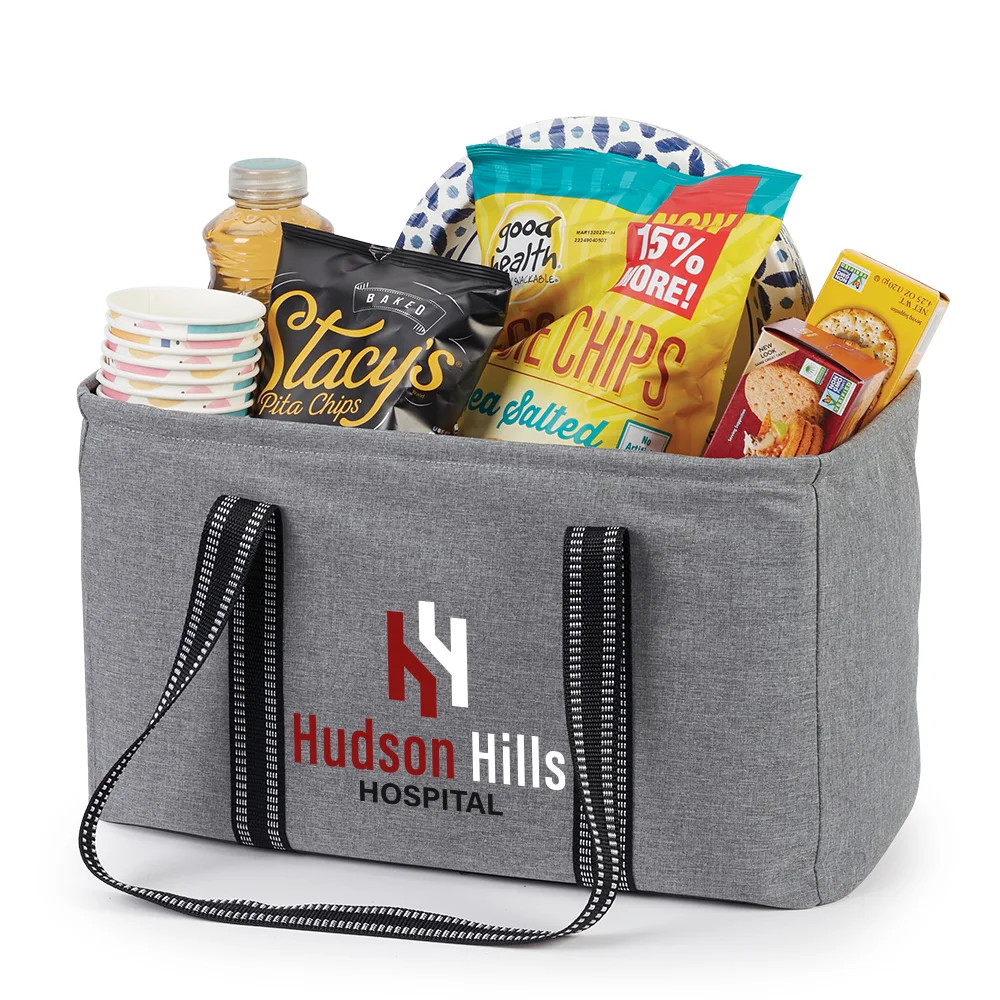 Personalized Tote: Large main compartment with wire rim to hold its shape; Collapses flat for easy storage; Stable base makes it easy to load and unload; Carries groceries, clothing, and daily essentials; Dual 33.5" black web carry handles; 600-denier polyester