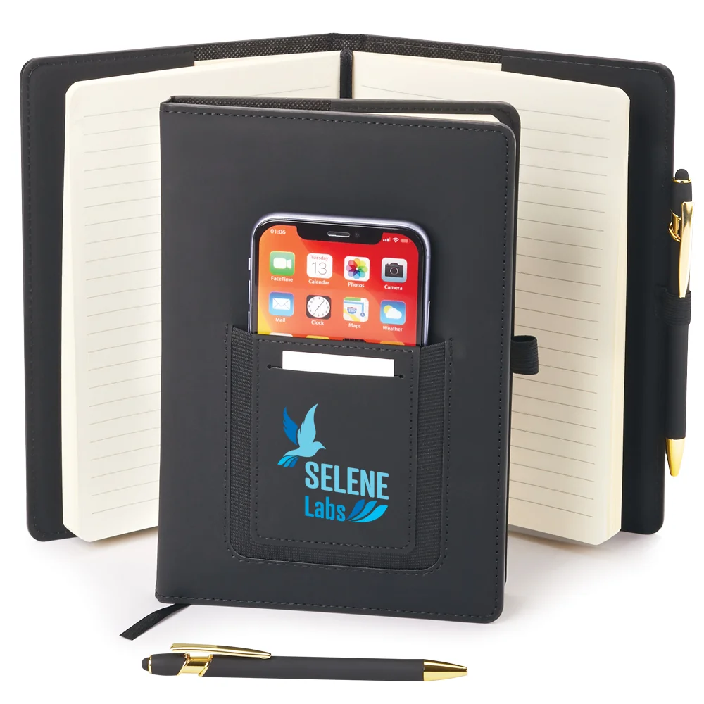 Personalized Refillable Journal: Hard cover made of padded, soft-touch vinyl with front business card pocket; Modern notebook keeps phone within reach, featuring an expandable phone pocket; Tuck loose notes into interior flaps; 80 lined pages; Notebook can be removed and refilled with a standard A5 notebook (not included); Ribbon bookmark & elastic pen loop; Metal stylus pen with rubberized finish and gold accents for jotting notes and navigating touchscreens; Black ink; Note: Pen remains blank