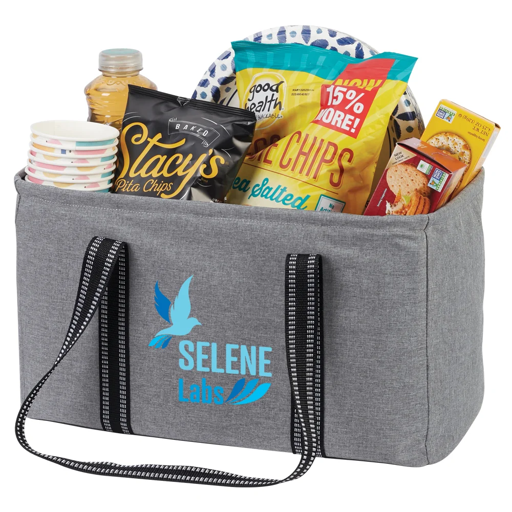 Personalized Tote: Large main compartment with wire rim to hold its shape; Collapses flat for easy storage; Stable base makes it easy to load and unload; Carries groceries, clothing, and daily essentials; Dual 33.5" black web carry handles; 600-denier polyester