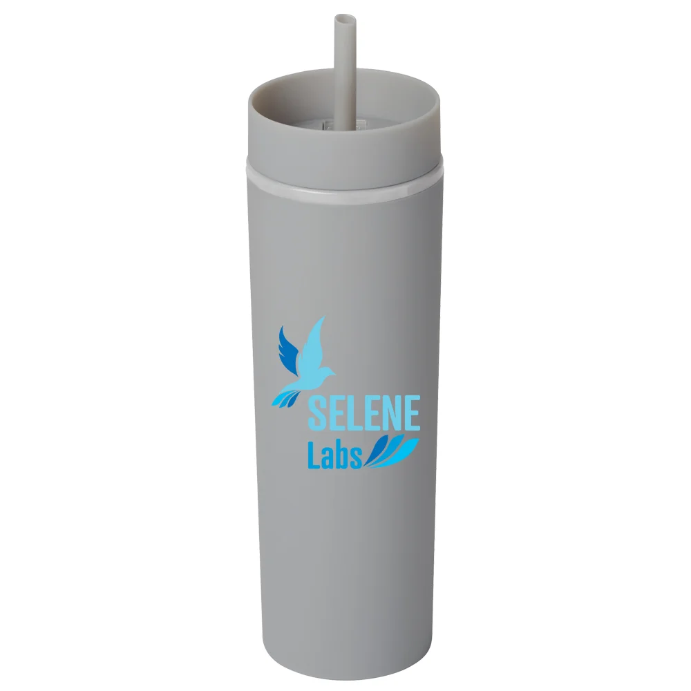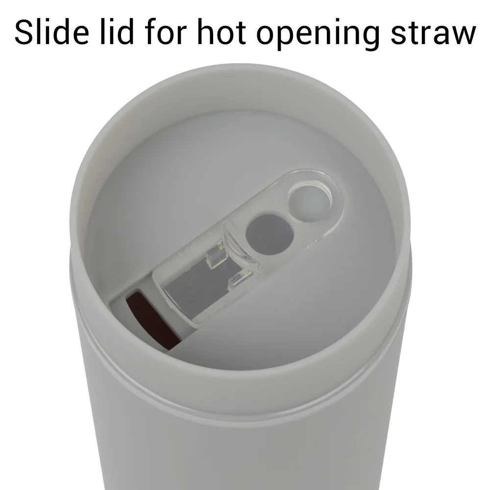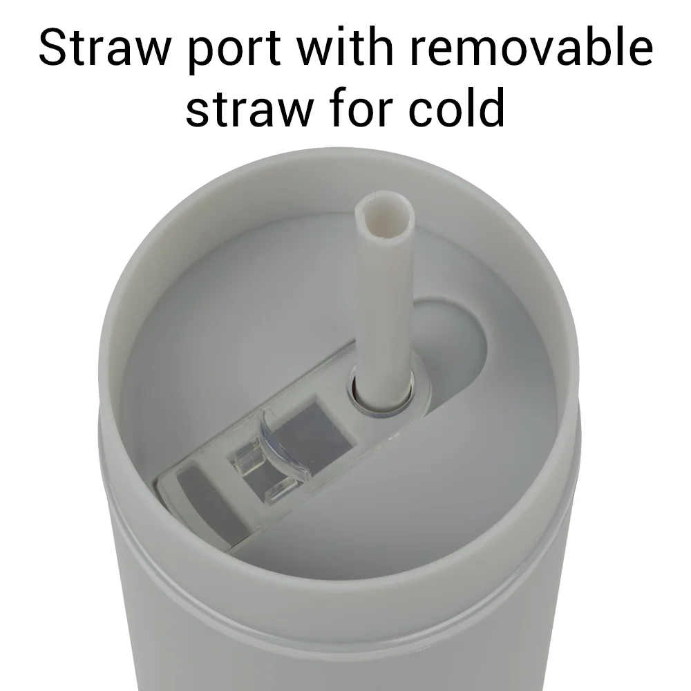 Personalized 16-oz. Tumbler: Sipping simplified: one lid, two ways to enjoy hot or cold beverages on the go; Double-walled acrylic body with easy-grip, satin, rubberized finish; Screw-on lid with two ways to sip: slide lid opening for hot drinks & straw port opening for cold drinks; Reusable soft straw included; Slips through straw port; Stopper on end prevents spills and keeps it in place; Eco friendly; Reusable; BPA free; Note: Hand wash recommended