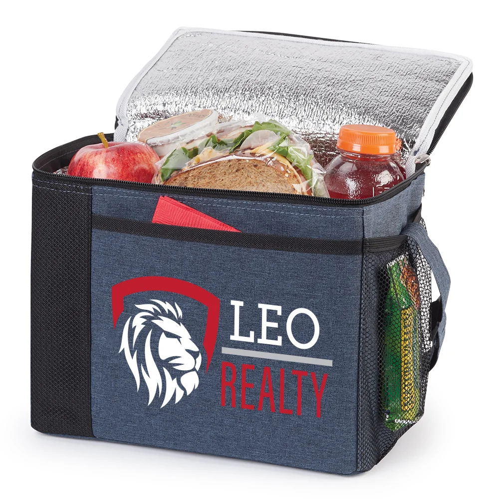 Personalized Lunch/Cooler Bag: Reusable bag that keeps contents fresh on the go; Flip-top lid with zip-around closure; Two zipper pulls for full access to large compartment; Front slip pocket for utensils or small essentials; Side mesh pocket stores even more; Insulated lining is easy to wipe clean; Strap adjusts for hand or shoulder carry; ID window on back; Holds up to 8 cans; Heathered 300-denier polyester with contrast trim