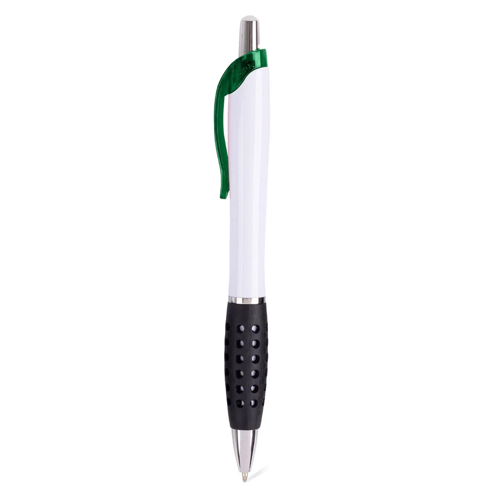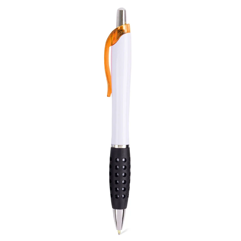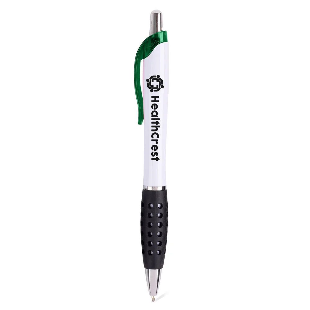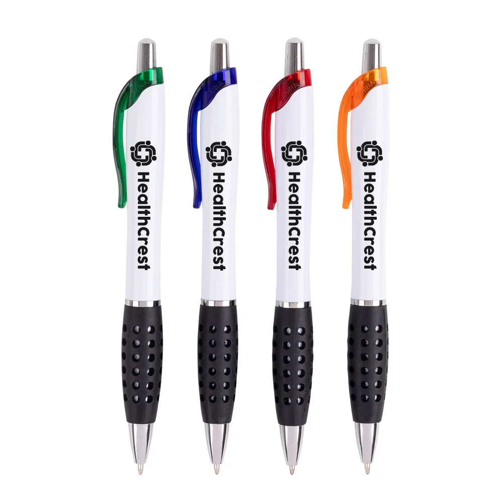 A classy and contoured curvaceous white barrel, with a black dotted rubber grip and colored trim, this hourglass shaped retractable click pen is definitely a great value for a modest price
