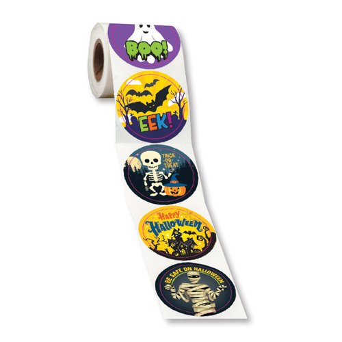Each roll features an assortment of five unique, colorful, Halloween-themed sticker designs as shown