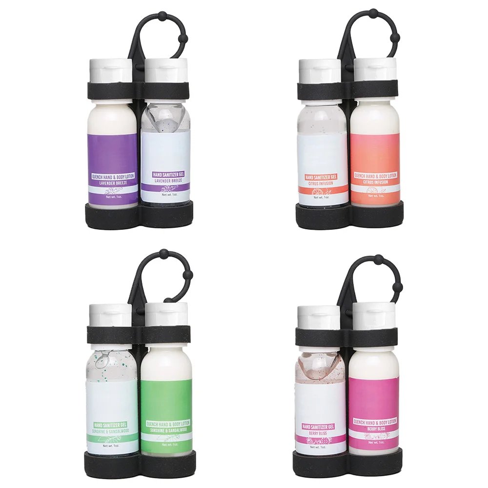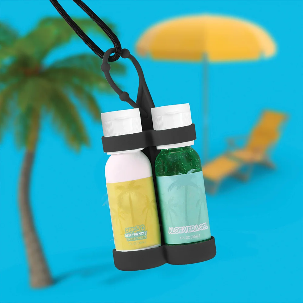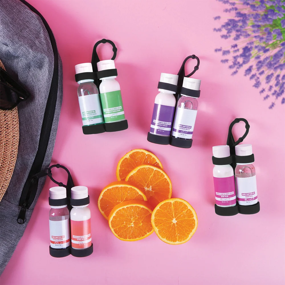 Silicone carabiner holds two 1-oz. flip-top bottles filled with perfectly paired combos for health and hygiene on the go