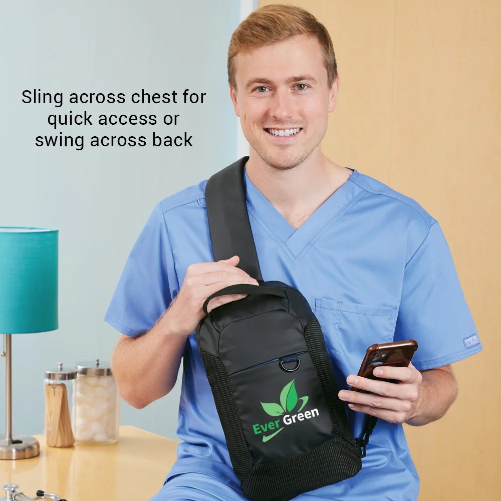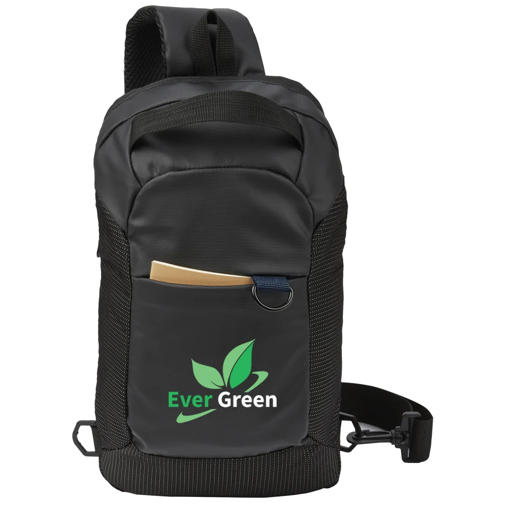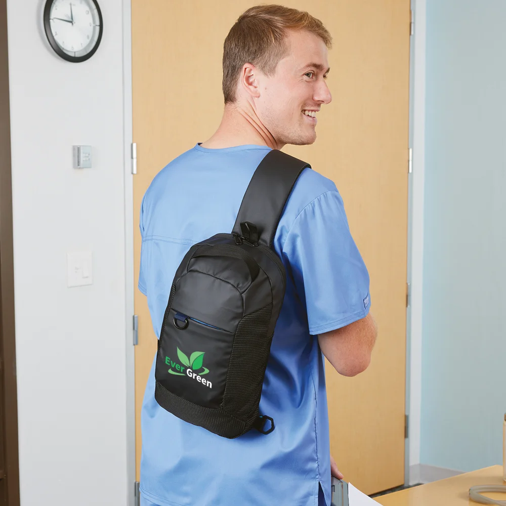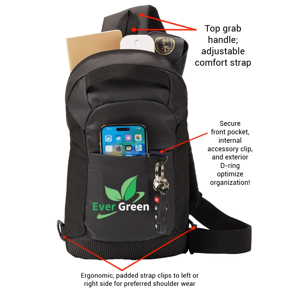 Personalized Crossbody Bag: Large, zippered main compartment; Sling across chest for quick access or swing across back; Secure front pocket, internal accessory clip, and exterior D-ring optimize organization; Padded mesh back panel for comfort; Durable jacquard fabric: 600-denier and 210-denier polyester with blue lining and protective PE foam padding; Textured, water-resistant exterior withstands daily wear and tear; Ergonomic, padded, adjustable comfort strap clips to left or right side for preferred shoulder wear; Top grab handle for in-hand carry