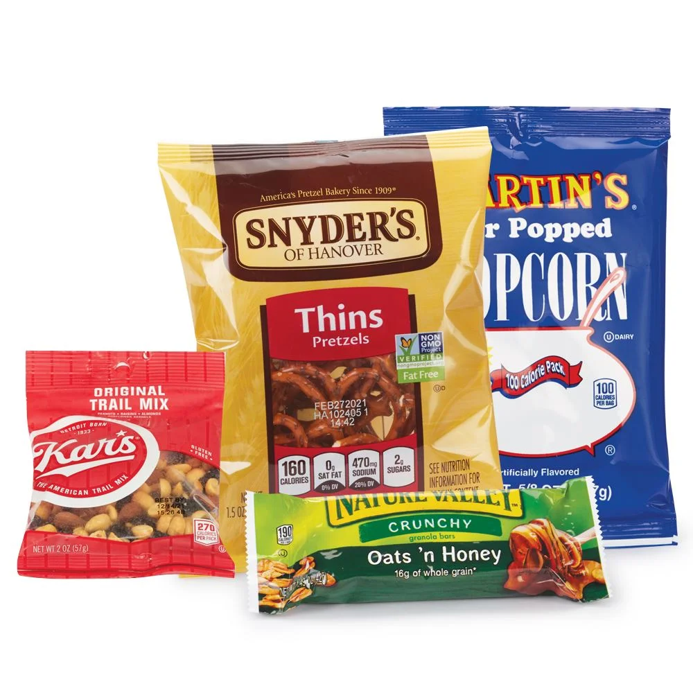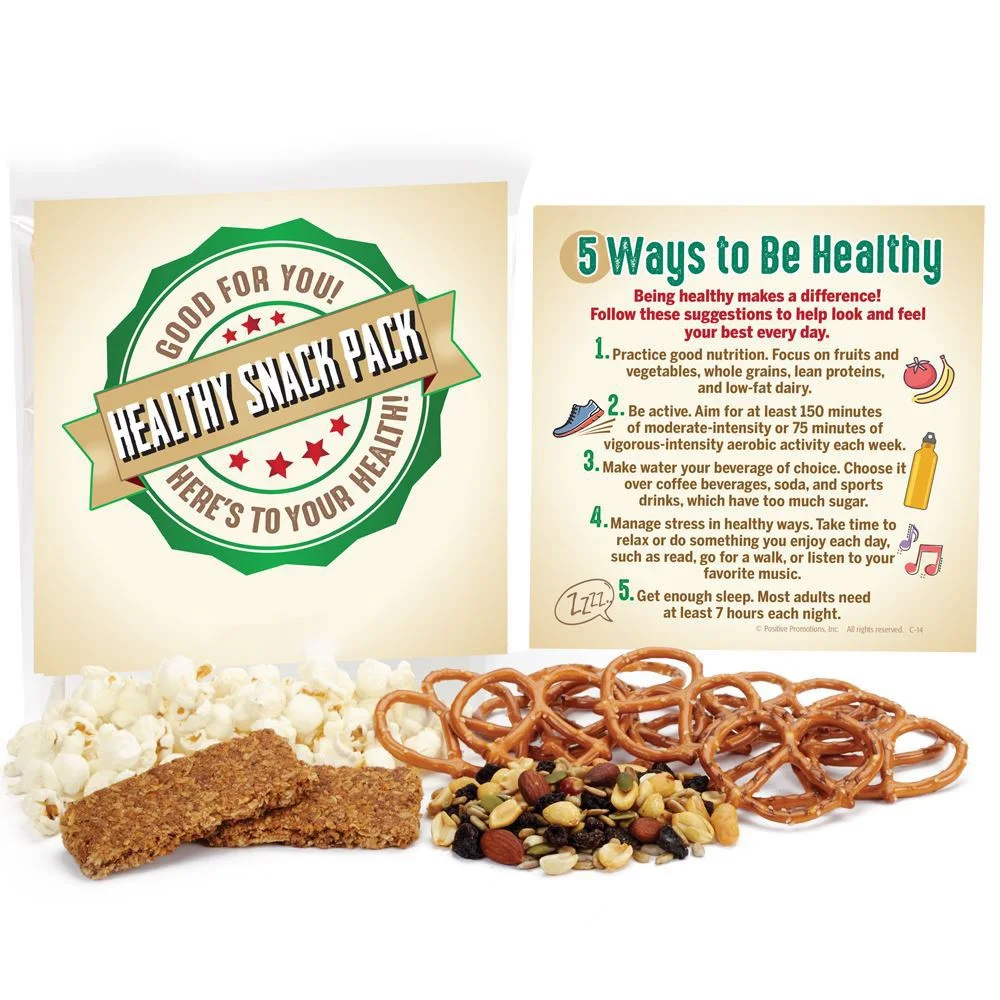 Give employees a healthier way to snack while showing your appreciation with this pack containing snack size bags of: Trail mix; Popcorn; Pretzels; Granola bar