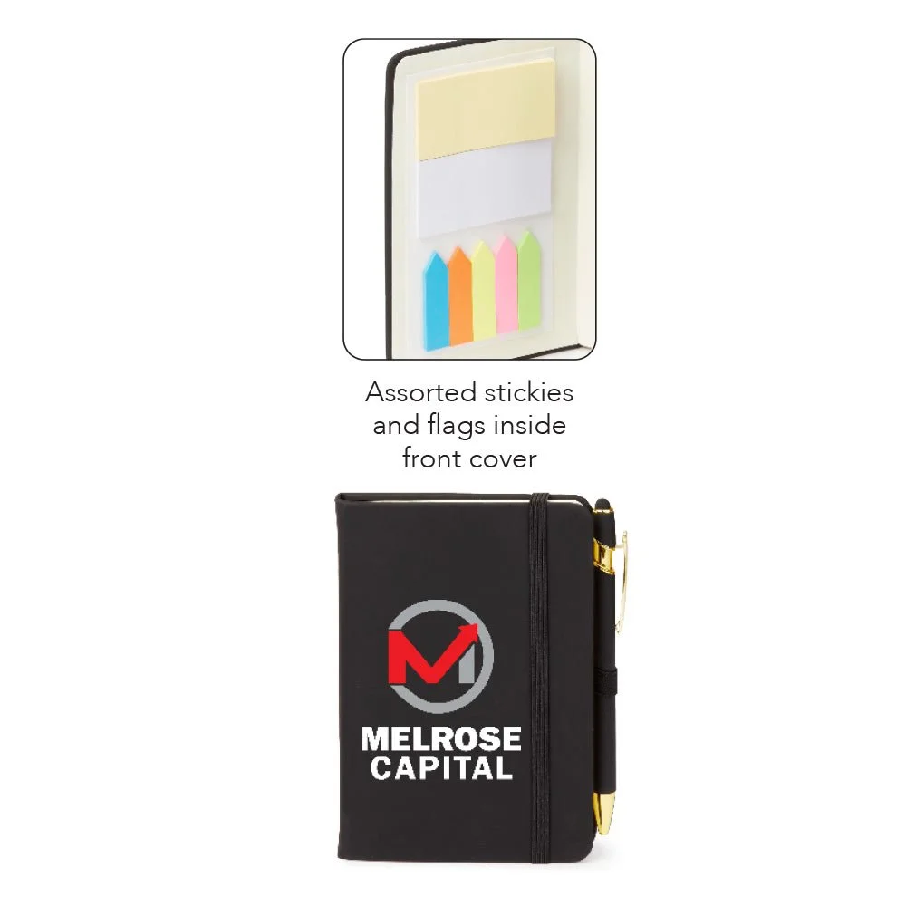 Jotter, Notes, & Pen Set: Padded, soft-touch, leather-like, hard-cover jotter; 80 lined pages for all your note-taking needs; Inside cover holds two 2.75" x 1.25" sticky pads and five 1.75" x 1.5" neon sticky flag pads (25 each of 5 colors - 125 flags total!); Ribbon page marker keeps your place; Elastic strap closure keeps everything secure; Elastic pen loop holds the included metal stylus pen with smooth, rubberized finish and gold accents; Black ink