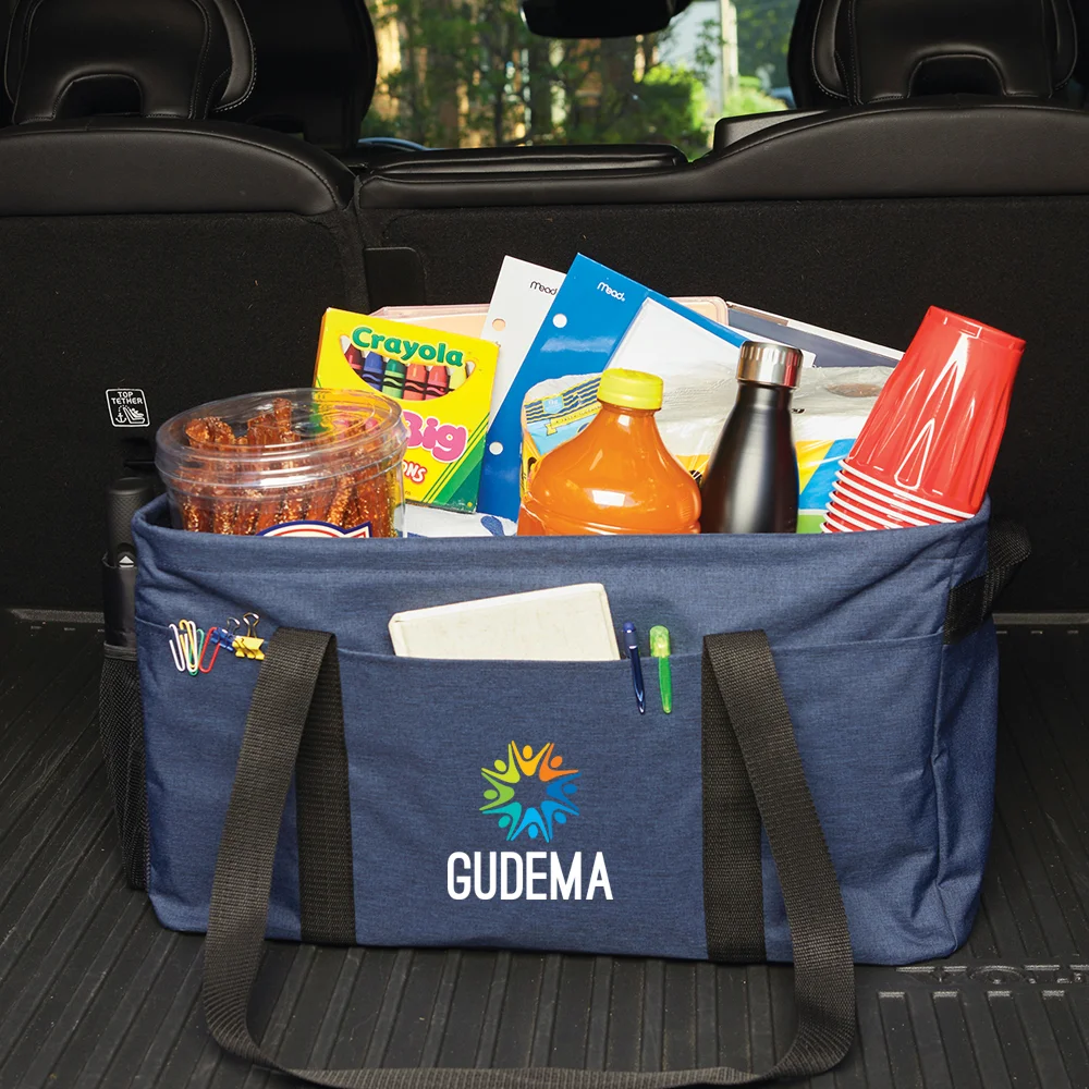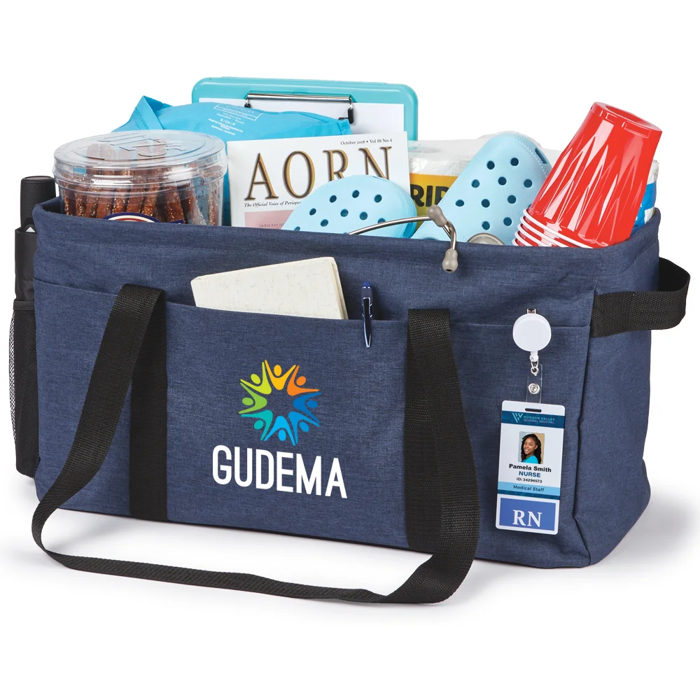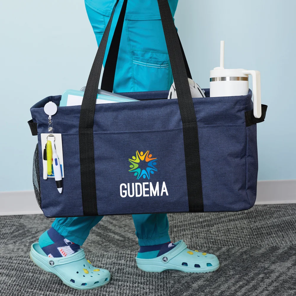 Personalized Utility Tote: Unlimited versatility: tote big loads on the go or use as a storage bin or closet organizer; Extra-large compartment with wire support to hold shape; Hard bottom for stability; 3 front pockets and mesh side pocket transport even more; Convenient carry: long straps AND grab handles on each end; Collapses for space-saving storage; 600-denier polyester & 300-denier heathered polyester