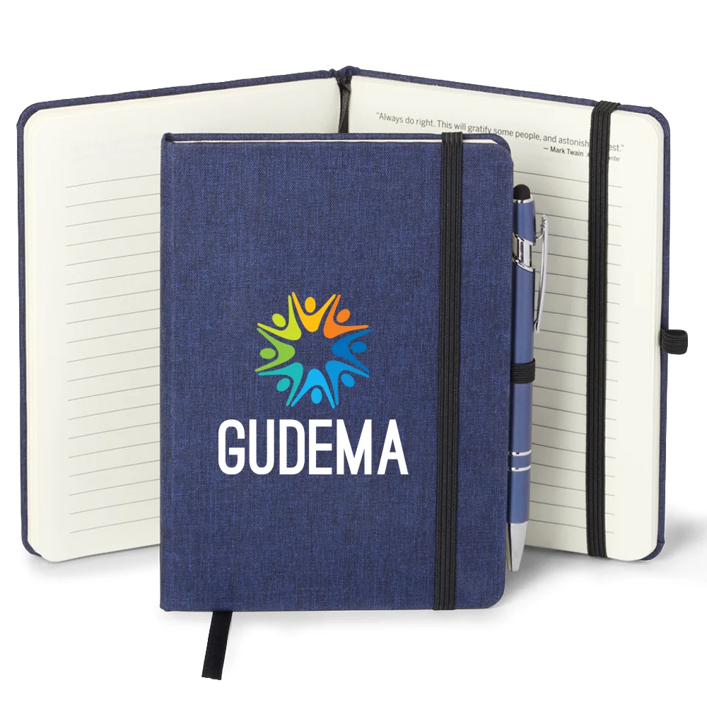 Personalized Journal & Stylus: Heathered, linen-like hard cover; 80 lined pages; Includes inspirational quotes on the top of each right page; Ribbon bookmark, elastic closure, and elastic pen loop; Stylus Pen included for note-taking and touchscreen navigation; Black ink