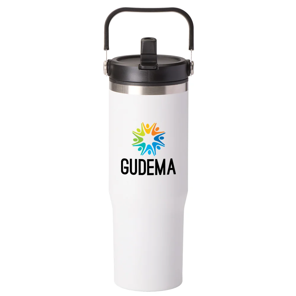 Personalized 30-oz. Bottle: Features a QR code on the back that recipients can scan to reveal a fresh, uplifting quote every day; Double-wall insulated: stainless-steel exterior, plastic liner; Secure lid for leak-resistant transport; Spout with built-in straw flips up to sip, snaps shut to minimize mess; Handle swings up for grab-and-go carry; Durable powder-coated finish resists scratches and stops condensation; Fits most car cup holders; Eco friendly; Reusable; BPA free; Note: Hand wash