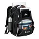 It has a CD player pocket with headphone port, smartphone pocket, and side mesh water bottle pockets