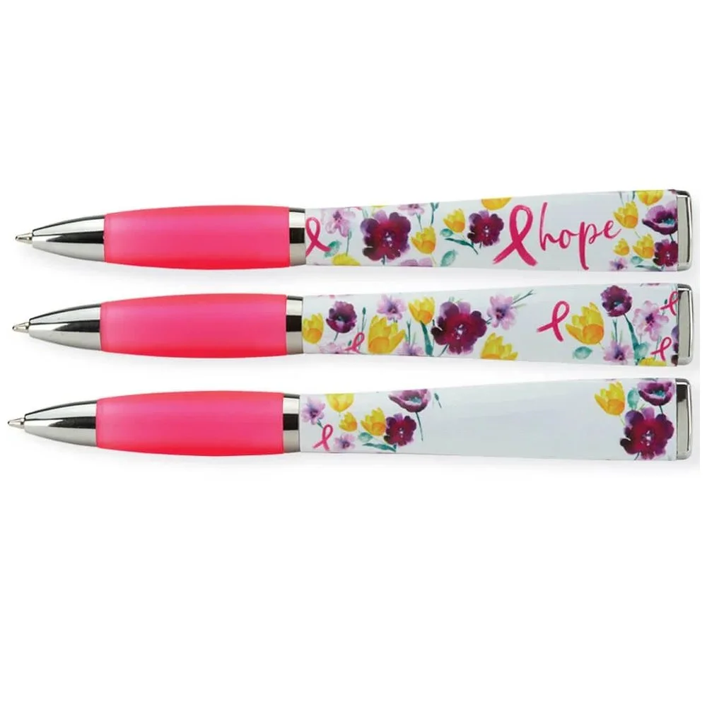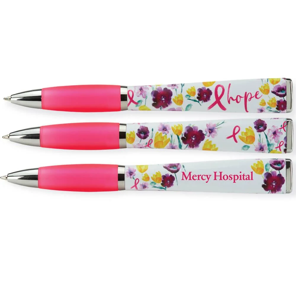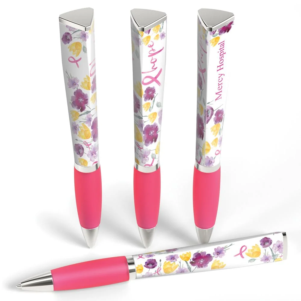 Maximize breast cancer awareness: our exclusive full-color hope pink ribbon floral design on two sides of the pen, with your custom imprint on the third side