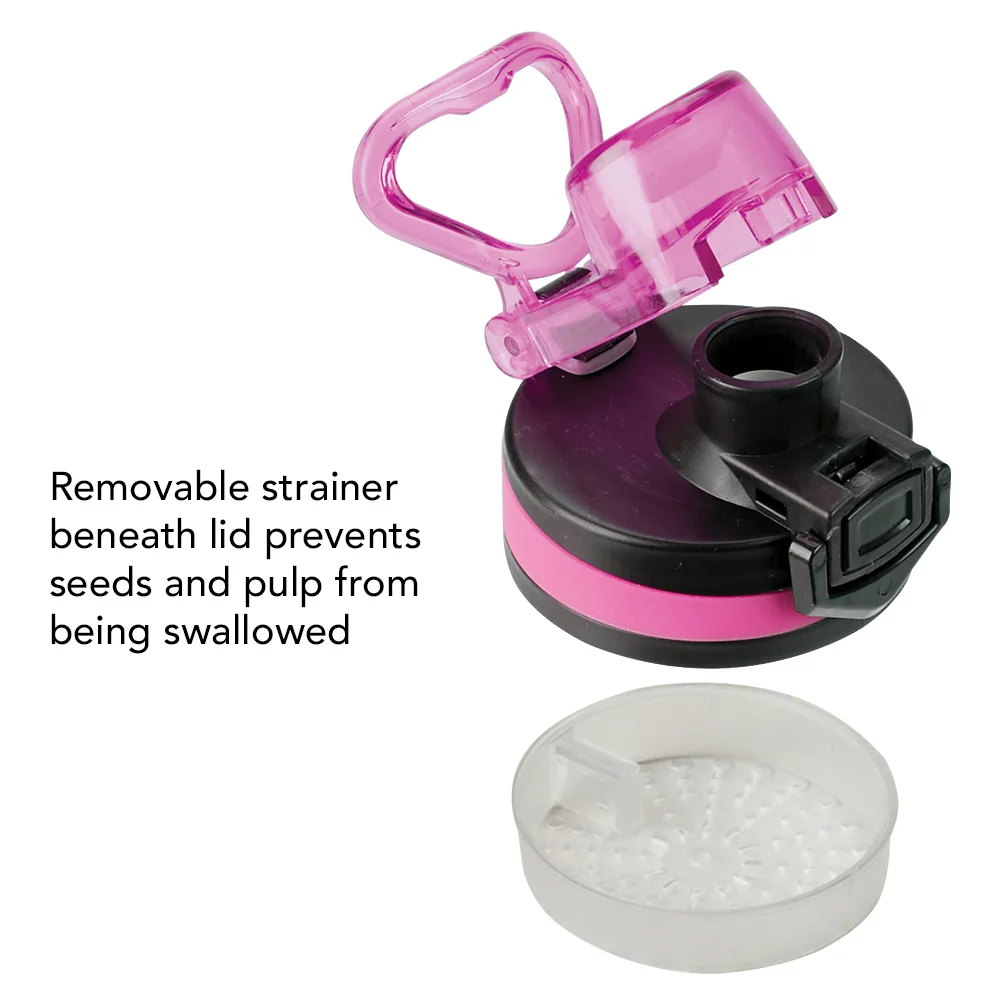 Removable strainer beneath lid prevents seeds and pulp from being swallowed
