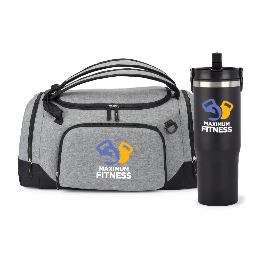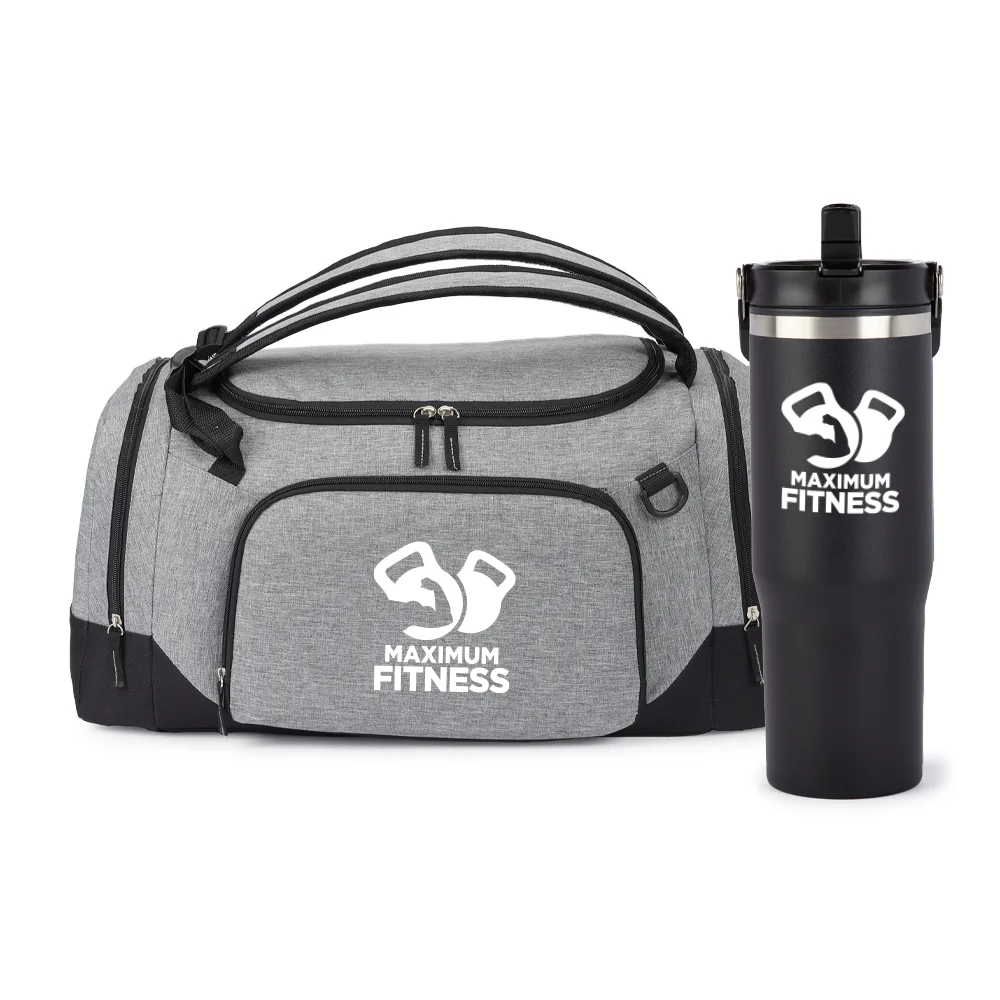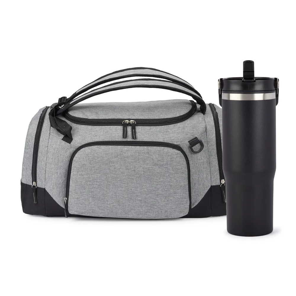 2-piece gift set includes: 2-in-1 Hybrid Duffel Bag/Backpack & Coldflow Double-Wall Flip-Straw Bottle 30 oz. With Carry Handle