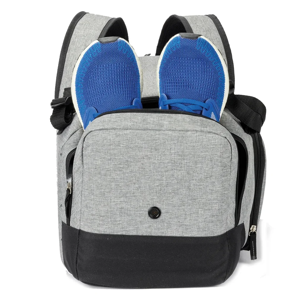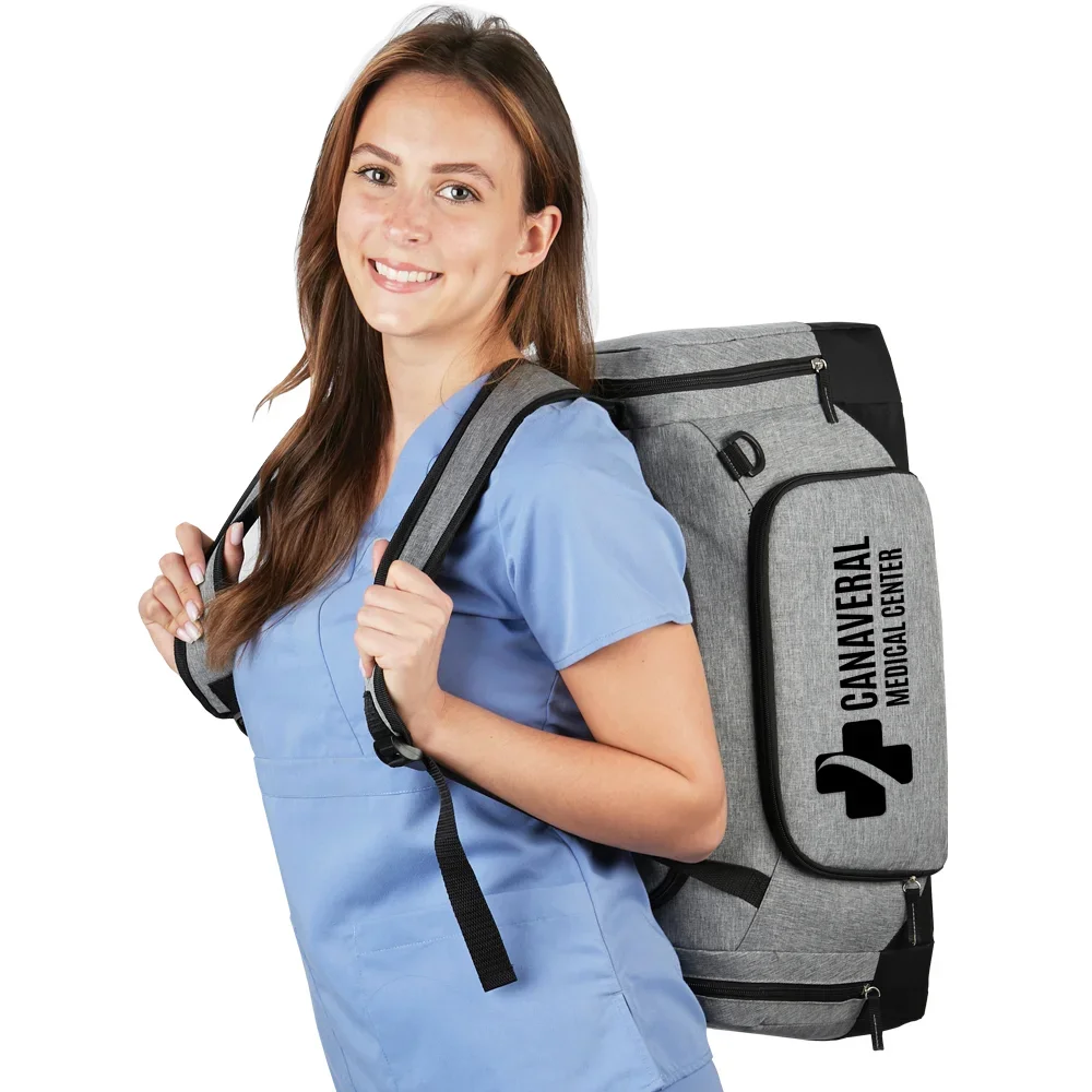 Personalized Duffel Bag/Backpack: Easily converts from duffel to backpack; Two-tone design with adjustable backpack straps; Large main compartment with U-shaped opening; Front zippered pocket; Dedicated side zippered pocket for shoes or dirty clothes with vent grommet for breathability; Padded, adjustable straps can be ergonomically carried in hand, on the shoulder, or on the back; D-ring attachment for keys, ID badges, etc.; 300-denier polyester