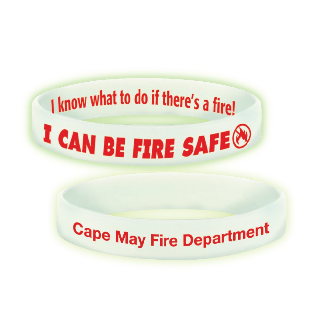 Trendy glow-in-the-dark bracelet displays unique 2-sided fire safety messages