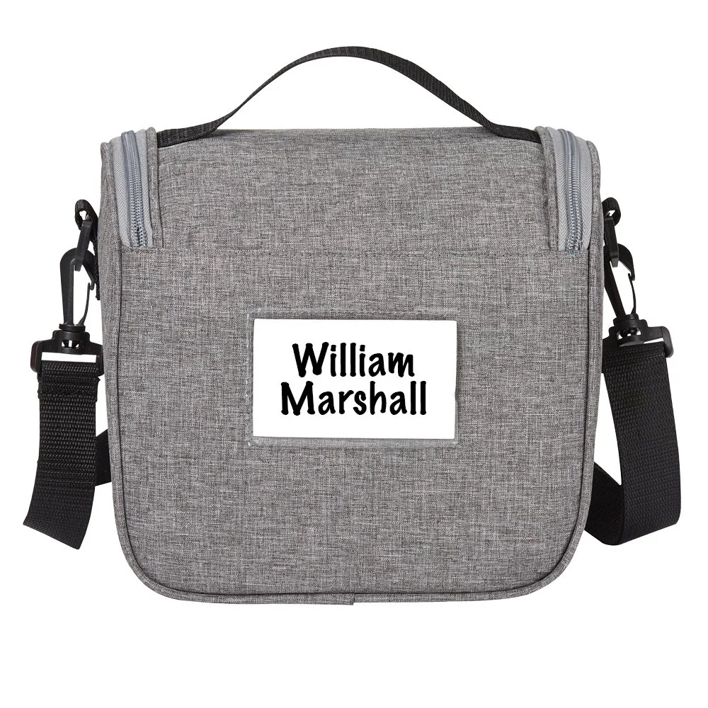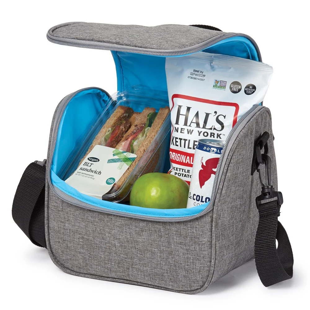 • Lunch/Cooler Bag: Dual-zip, foam-insulated, leak-resistant compartment ideal for stacking containers or up to 6 cans with ice; Interior is easy to wipe clean in case of any spills; Fits most food containers for convenient meals on the go; Exterior slip pocket for napkins and quick-grab items; Heathered 300-denier material with bright-blue lining and PEVA foam insulation; Adjustable, removable strap for shoulder or crossbody carry; Top carry handle; ID window on the back