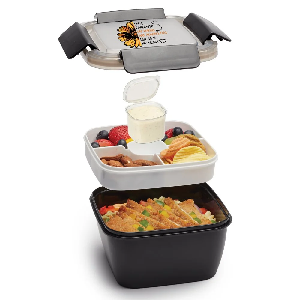 • Food Container: Travel-friendly food container keeps entire meal fresh and organized; Plastic and silicone construction with hinged locking tabs creates an airtight, spill-resistant lid; Entree-sized bottom compartment holds 54 oz. (6.75 cups); Multi-compartment tray separates fruits, veggies, and sides; Sits on top of large compartment; Removable, lidded container in center holds 3 oz. of toppings, dips, or dressing; Included reusable fork tucks neatly inside; Eco friendly; BPA free; Note: Freezer, microwave, and dishwasher safe