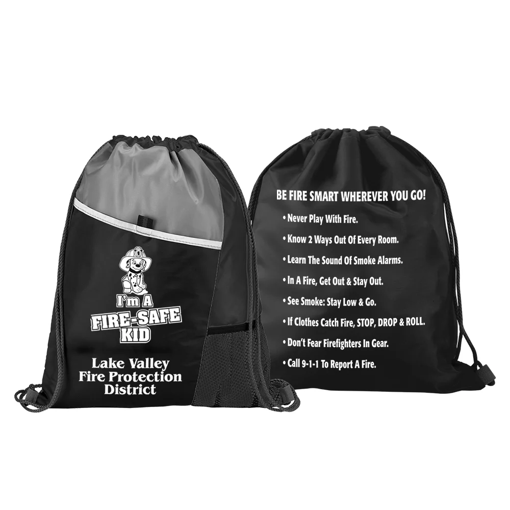 Personalized Deluxe Drawstring Backpack: Cinch up and carry on shoulders; Large front pocket, large mesh side pocket, and pen loop; Reflective safety strip for visibility at night; I'm A Fire-Safe Kid design on front; Fire-safety tips on back