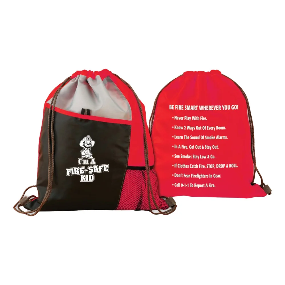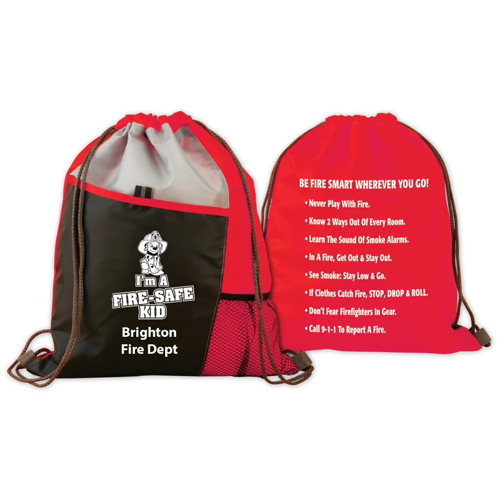 Personalized Deluxe Drawstring Backpack: Cinch up and carry on shoulders; Large front pocket, large mesh side pocket, and pen loop; Reflective safety strip for visibility at night; I'm A Fire-Safe Kid design on front; Fire-safety tips on back