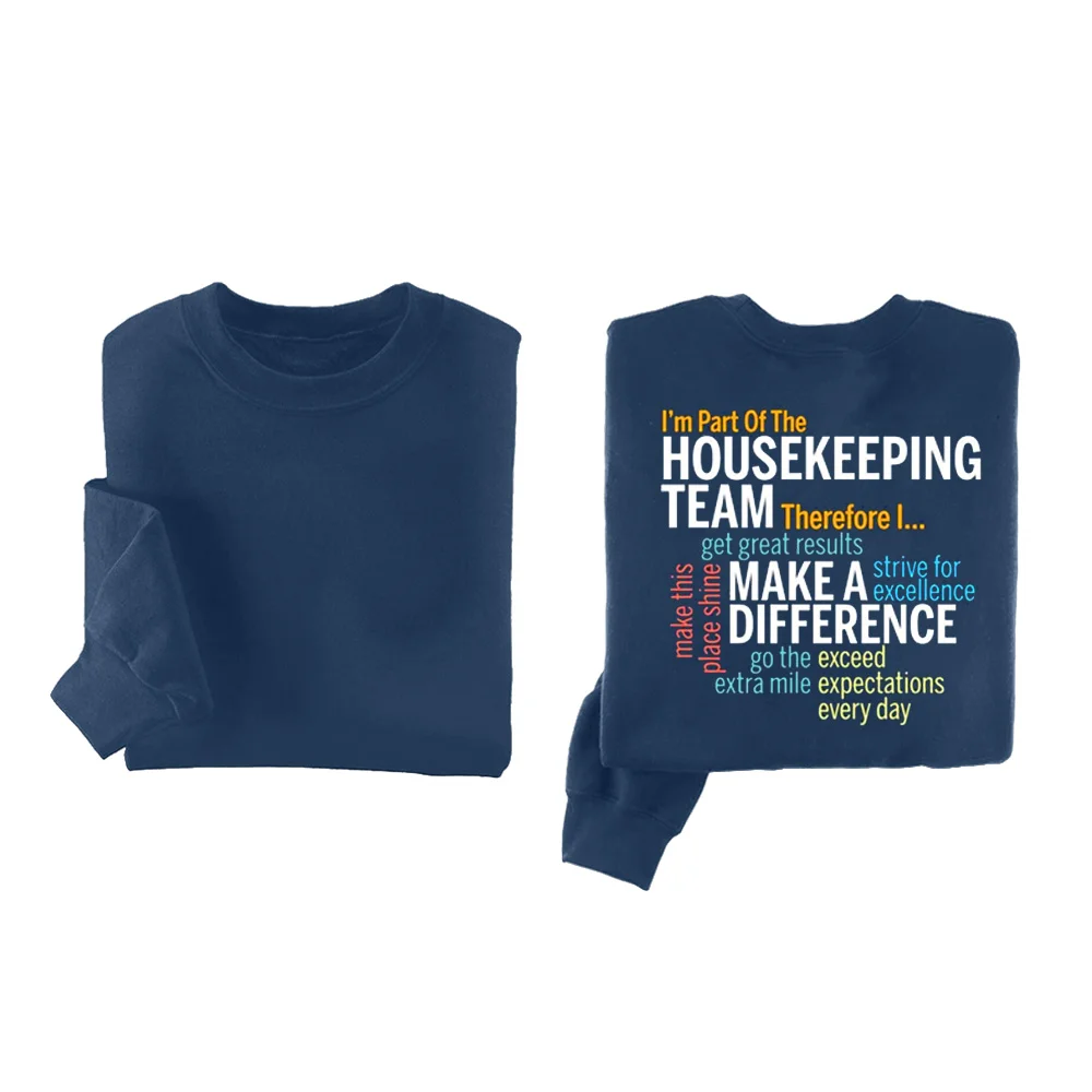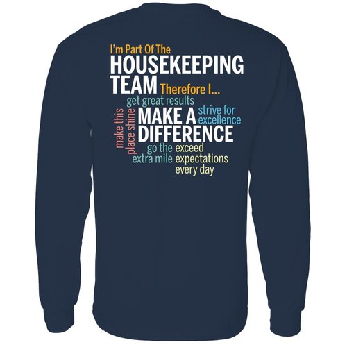 Available with our exclusive I'm Part Of The Housekeeping Team Word Cloud design on back and your screenprinted personalization on the front upper left chest