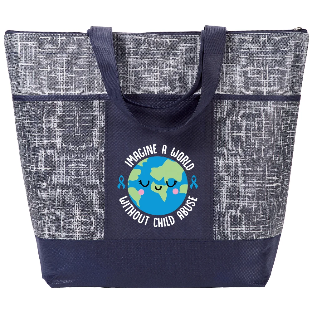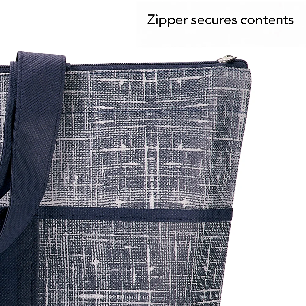 Tote Bag: Carryall with distressed "denim" look and solid accents; Stylish, reusable alternative to single-use bags; Secure, zip-top tote with generous 5" bottom gusset; Three front pockets for grab-and-go essentials; Reinforced shoulder straps: Dual 25 1/4" carry handles in solid color coordinate with trendy distressed-look denim pattern; Non-woven polypropylene is eco friendly and recyclable; Reusable