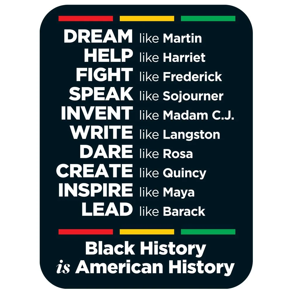 DREAM like Martin; HELP like Harriet; FIGHT like Frederick; SPEAK like Sojourner; INVENT like Madam C.J.; WRITE like Langston; DARE like Rosa; CREATE like Quincy; INSPIRE like Maya; LEAD like Barack