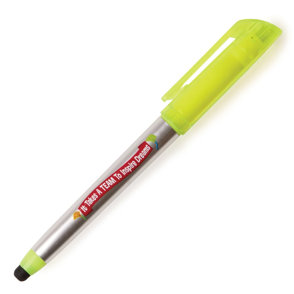 Silver barrel pen with bright accents lets you write, highlight, and scroll with ease