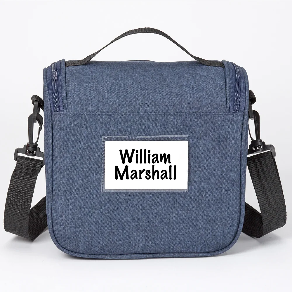 Lunch/Cooler Bag: Dual-zip, foam-insulated, leak-resistant compartment ideal for stacking containers or up to 6 cans with ice; Interior is easy to wipe clean in case of any spills; Fits most food containers for convenient meals on the go; Exterior slip pocket for napkins and quick-grab items; Heathered 300-denier material with bright-blue lining and PEVA foam insulation; Adjustable, removable strap for shoulder or crossbody carry; Top carry handle; ID window on the back