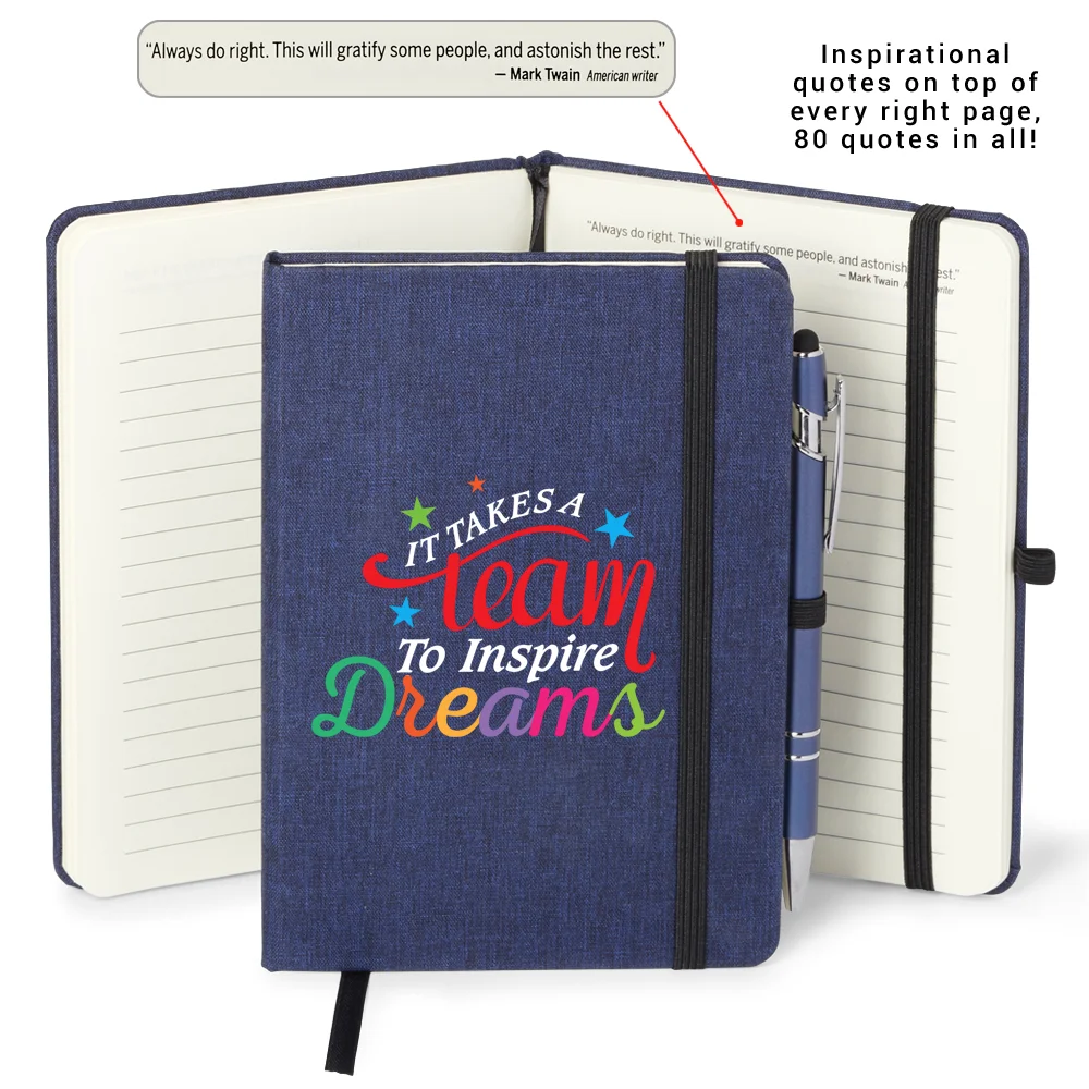 Journal & Stylus: Heathered, linen-like hard cover; 80 lined pages; Includes inspirational quotes on the top of each right page; Ribbon bookmark, elastic closure, and elastic pen loop; Stylus Pen included for note-taking and touchscreen navigation; Black ink
