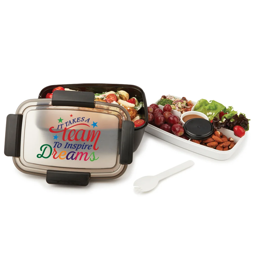 Stacker Container: Two plastic, rectangular stacking containers with a hinged, locking lid; Fork included; Airtight lid with silicone ring seals in freshness and prevents spills; Large bottom container holds 68 oz. (8.5 cups); 4-compartment top tray (2 sections hold 5 oz., 2 hold 3.5 oz.) separates snacks; Lidded, removable 3-oz. container stores dressing, toppings, or sauces; Eco friendly; Reusable; BPA free; Note: Microwave and freezer safe; Dishwasher safe after lid and compartments removed