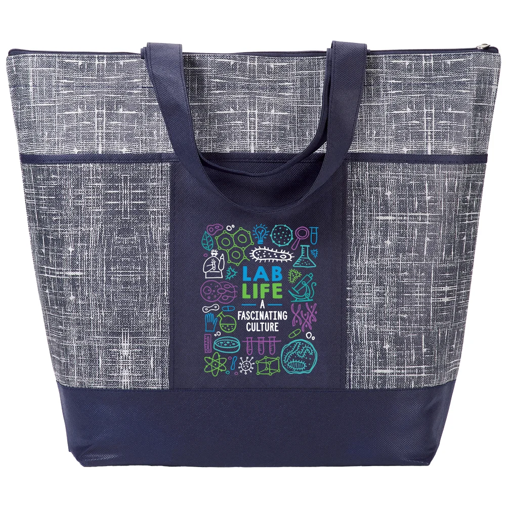 Tote Bag: Carryall with distressed "denim" look and solid accents; Stylish, reusable alternative to single-use bags; Secure, zip-top tote with generous 5" bottom gusset; Three front pockets for grab-and-go essentials; Reinforced shoulder straps: Dual 25 1/4" carry handles in solid color coordinate with trendy distressed-look denim pattern; Non-woven polypropylene is eco friendly and recyclable; Reusable